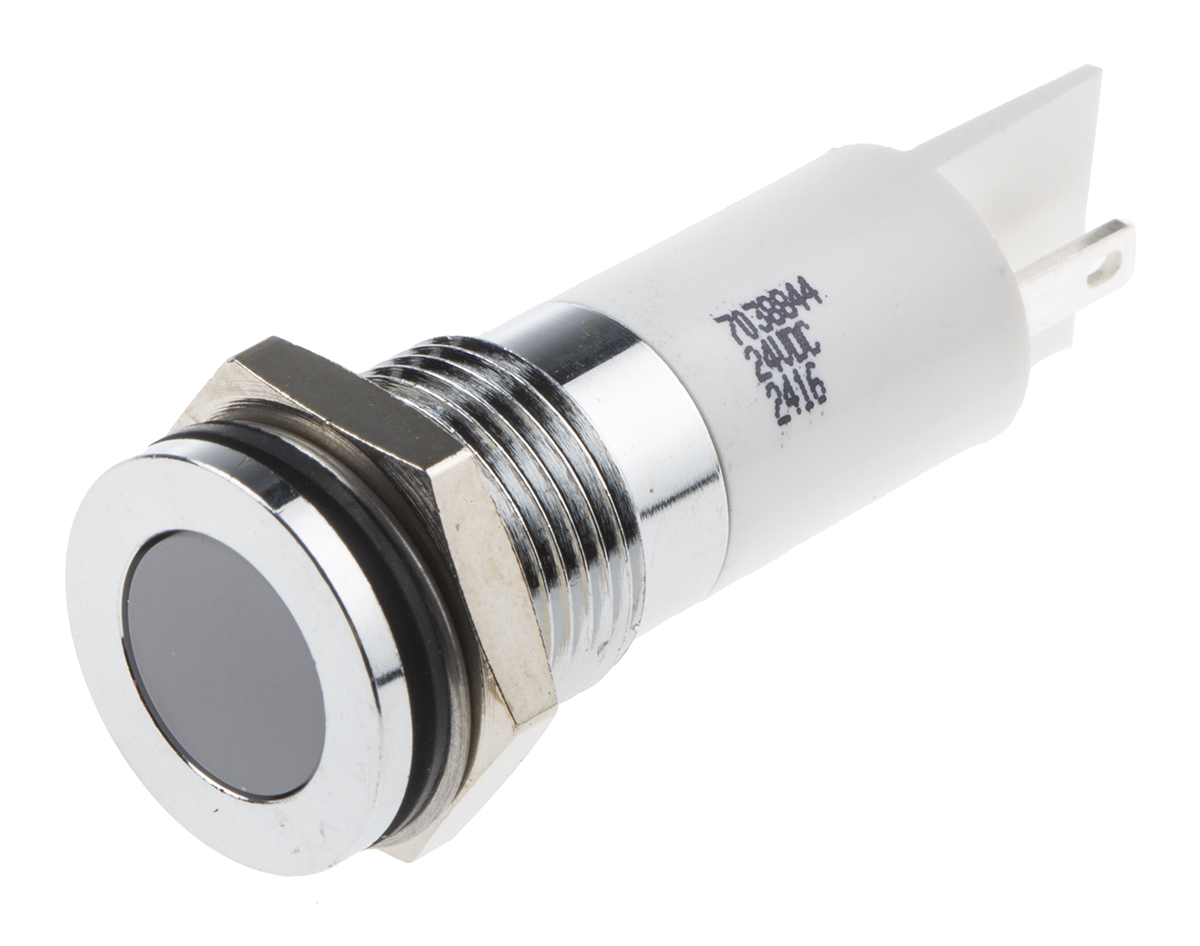 This is White LED Indicator 24 V dc 10 mm Lamp Size 14mm Mounting Hole Size IP67 manufactured by RS Pro. The manufacturer part number is 703-8844. Regarding light output colour, it outputs white light colour. The product has a current rating of 20ma. The product is designed with a solder tab termination. In addition, It features 14mm of mounting hole size. It is IP rated with ip67. Furthermore, the bezel has a classic chrome colour. Moreover, the product has a nominal 24v dc voltage rating. The given intensity of the product is 20mcd. Its accurate length is 35.6mm. The bezel features a flush style. It is a type of led lamp.