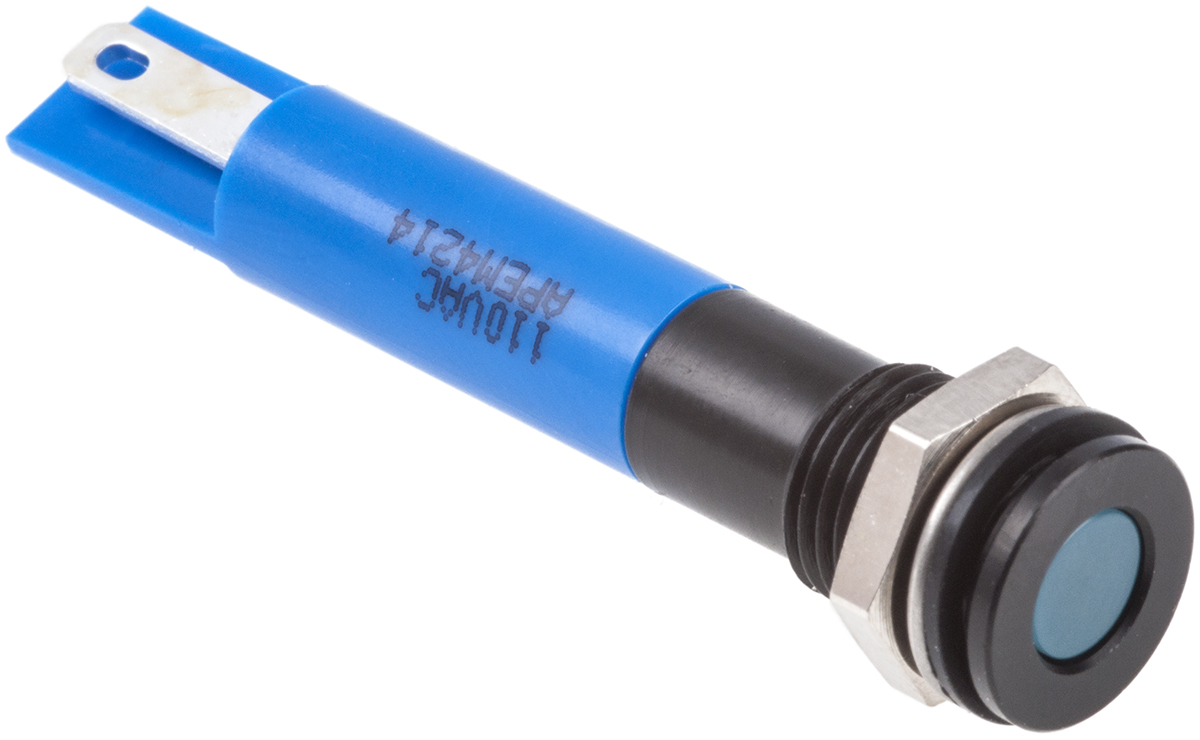This is Flush Indicator Panel Mount 8mm Mounting Hole Size Blue LED Solder Lug Termination 9.5 mm Lamp Size 110 V ac manufactured by RS Pro. The manufacturer part number is 846-2816. Regarding light output colour, it outputs blue light colour. The product has a current rating of 6ma. In addition, It features 8mm of mounting hole size. It is IP rated with ip67. Moreover, the product has a nominal 110v ac voltage rating. The given intensity of the product is 50mcd. Its accurate length is 34.9mm. The bezel features a flush style. It is a type of led lamp.