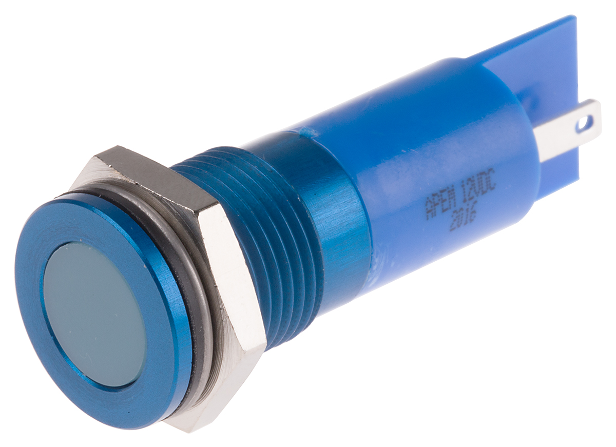 This is Blue Indicator 12 V dc 10 mm Lamp Size 14mm Mounting Hole Size IP67 manufactured by RS Pro. The manufacturer part number is 111-6565. Regarding light output colour, it outputs blue light colour. The product has a current rating of 20ma. In addition, It features 14mm of mounting hole size. It is IP rated with ip67. Furthermore, the bezel has a classic blue colour. Moreover, the product has a nominal 12v dc voltage rating. The given intensity of the product is 100mcd. Its accurate length is 35.6mm. The bezel features a flush style. The product is designed with a faston, solder lug termination. It is a type of led lamp.