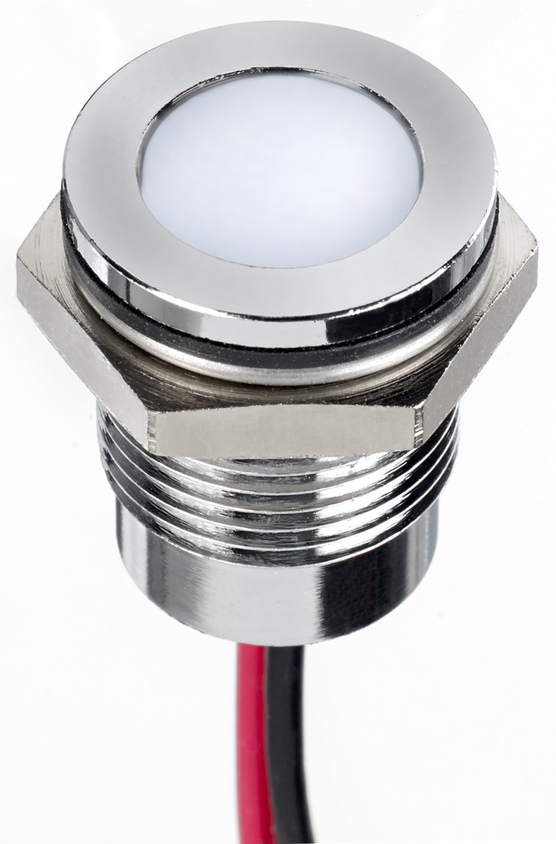 This is White Indicator 1.8 → 3.3 V dc 10 mm Lamp Size 14mm Mounting Hole Size IP67 manufactured by RS Pro. The manufacturer part number is 130-1099. Regarding light output colour, it outputs white light colour. The product has a current rating of 20ma. In addition, It features 14mm of mounting hole size. It is IP rated with ip67. Furthermore, the bezel has a classic chrome colour. Moreover, the product has a nominal 1.8 → 3.3v dc voltage rating. The given intensity of the product is 150mcd. Its accurate length is 19.4mm. The bezel features a flush style. The product is designed with a lead wires termination. It is a type of led lamp.
