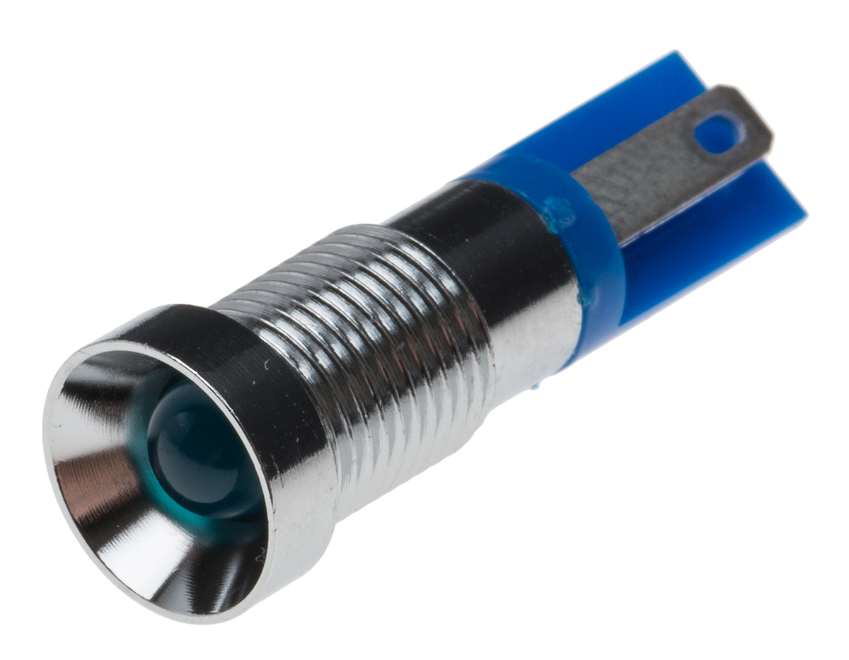 This is Blue Indicator 2 V dc 5 mm Lamp Size 8mm Mounting Hole Size manufactured by RS Pro. The manufacturer part number is 206-104. Regarding light output colour, it outputs blue light colour. The product has a current rating of 20ma. In addition, It features 8mm of mounting hole size. Moreover, the product has a nominal 2v dc voltage rating. Furthermore, the bezel has a classic chrome colour. The given intensity of the product is 90mcd. Its accurate length is 23mm. The bezel features a recessed style. The product is designed with a solder tab termination. It is a type of led lamp.