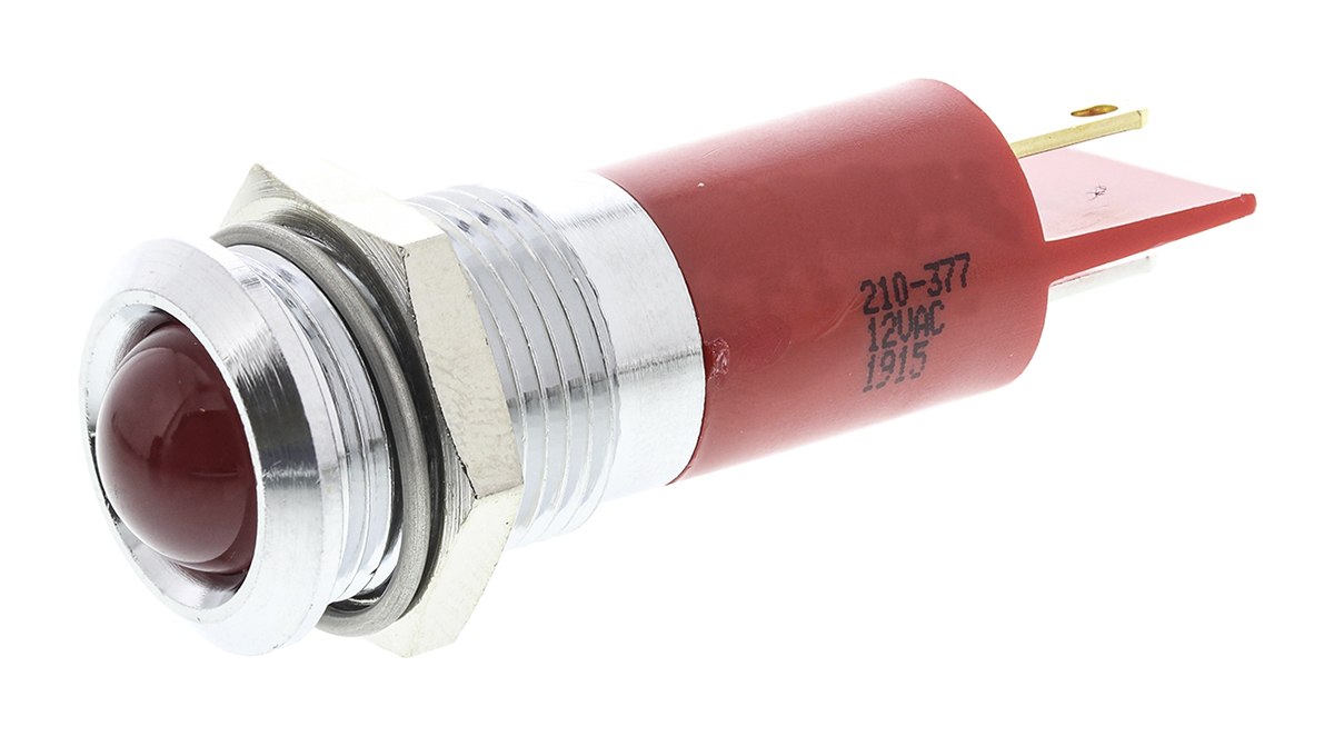 This is Red Indicator 12 V ac 10 mm Lamp Size 14mm Mounting Hole Size manufactured by RS Pro. The manufacturer part number is 210-377. Regarding light output colour, it outputs red light colour. The product has a current rating of 20ma. In addition, It features 14mm of mounting hole size. Moreover, the product has a nominal 12v ac voltage rating. Furthermore, the bezel has a classic chrome colour. The given intensity of the product is 80mcd. Its accurate length is 61mm. The bezel features a prominent style. The product is designed with a solder tab termination. It is a type of led lamp.