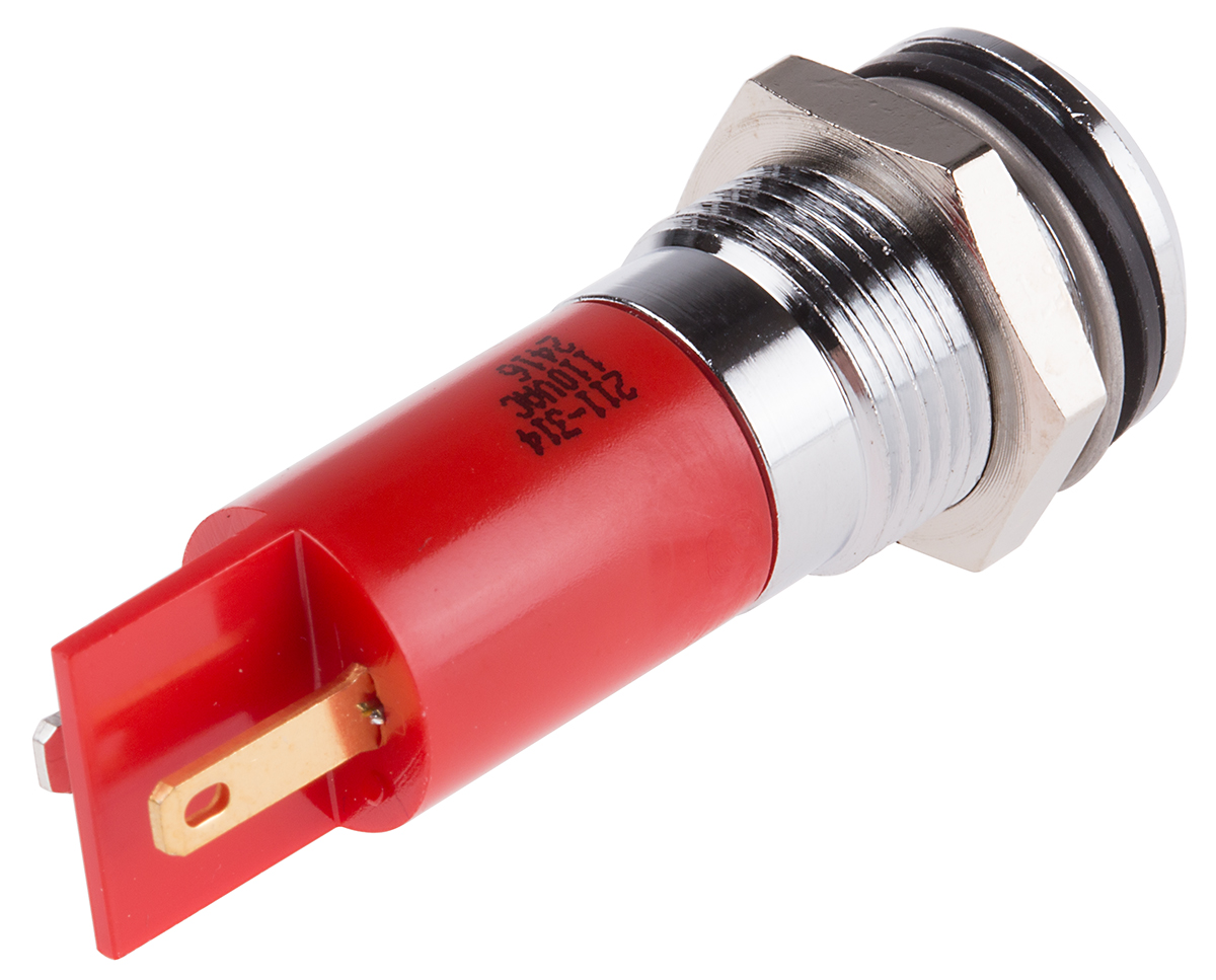This is Red neon Indicator 110 V 10 mm Lamp Size 14.5mm Mounting Hole Size IP40 manufactured by RS Pro. The manufacturer part number is 211-314. Regarding light output colour, it outputs red light colour. In addition, It features 14.5mm of mounting hole size. Moreover, the product has a nominal 110v ac voltage rating. Furthermore, the bezel has a classic chrome colour. It is IP rated with ip40. Its accurate length is 38.5mm. The bezel features a prominent style. The product is designed with a solder tab termination.