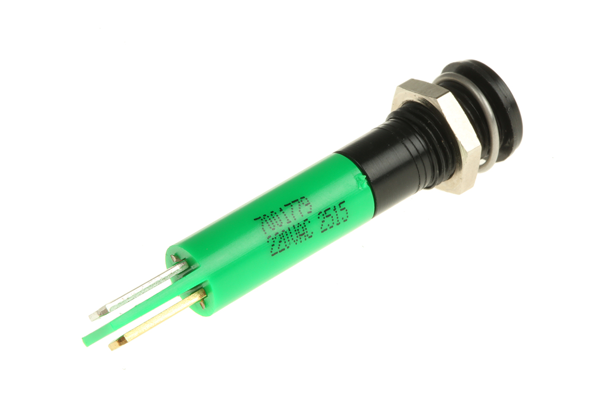 This is Green Indicator 220 V ac 5 mm Lamp Size 8mm Mounting Hole Size IP67 manufactured by RS Pro. The manufacturer part number is 700-1779. Regarding light output colour, it outputs green light colour. The product has a current rating of 20ma. In addition, It features 8mm of mounting hole size. It is IP rated with ip67. Moreover, the product has a nominal 220v ac voltage rating. The given intensity of the product is 8mcd. Its accurate length is 33.9mm. The bezel features a flush style. The product is designed with a solder tab termination. It is a type of led lamp.