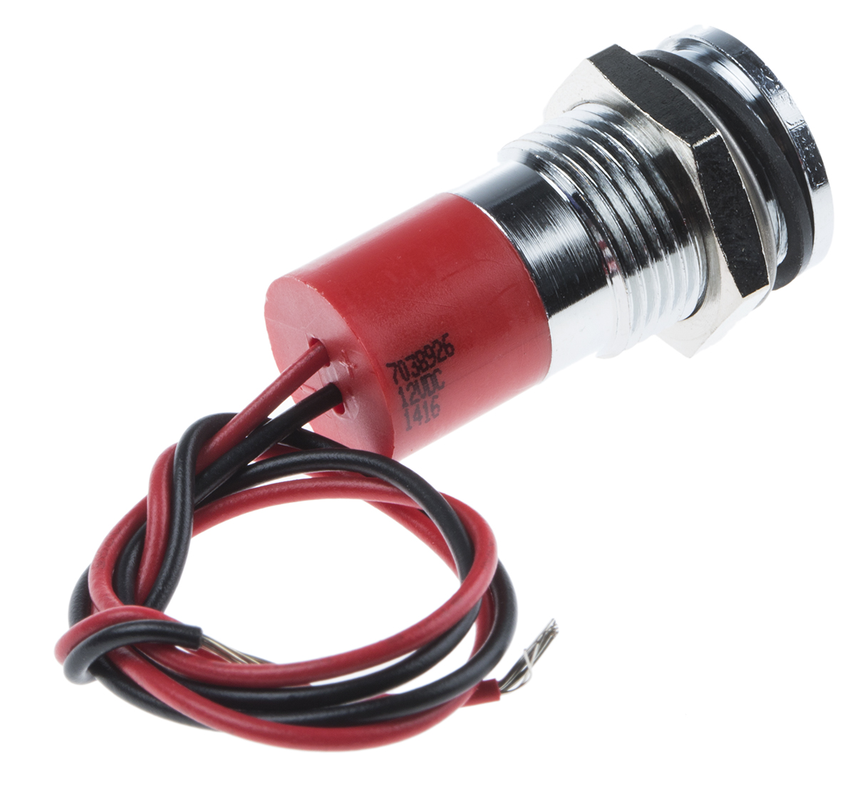 This is Red Indicator 12 V dc 10 mm Lamp Size 14mm Mounting Hole Size IP67 manufactured by RS Pro. The manufacturer part number is 703-8926. Regarding light output colour, it outputs red light colour. The product has a current rating of 20ma. The product is designed with a lead wires termination. In addition, It features 14mm of mounting hole size. It is IP rated with ip67. Furthermore, the bezel has a classic chrome colour. Moreover, the product has a nominal 12v dc voltage rating. Its accurate length is 30.6mm. The given intensity of the product is 10mcd. The bezel features a flush style. It is a type of led lamp.
