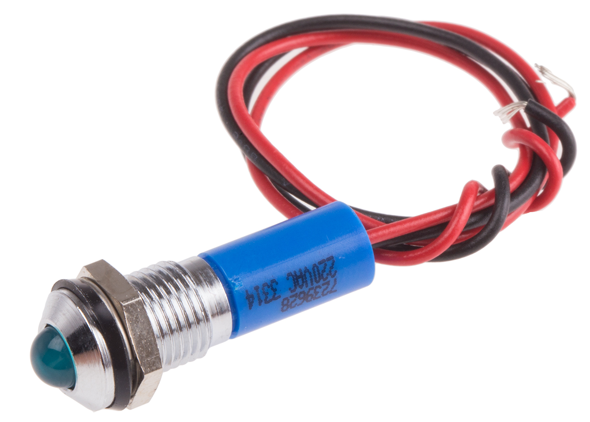 This is Blue Indicator 220 V ac 5 mm Lamp Size 8mm Mounting Hole Size IP67 manufactured by RS Pro. The manufacturer part number is 723-9628. Regarding light output colour, it outputs blue light colour. The product has a current rating of 3ma. In addition, It features 8mm of mounting hole size. It is IP rated with ip67. Furthermore, the bezel has a classic chrome colour. Moreover, the product has a nominal 220v ac voltage rating. The given intensity of the product is 90mcd. Its accurate length is 22.5mm. The bezel features a prominent style. The product is designed with a lead wires termination. It is a type of led lamp.