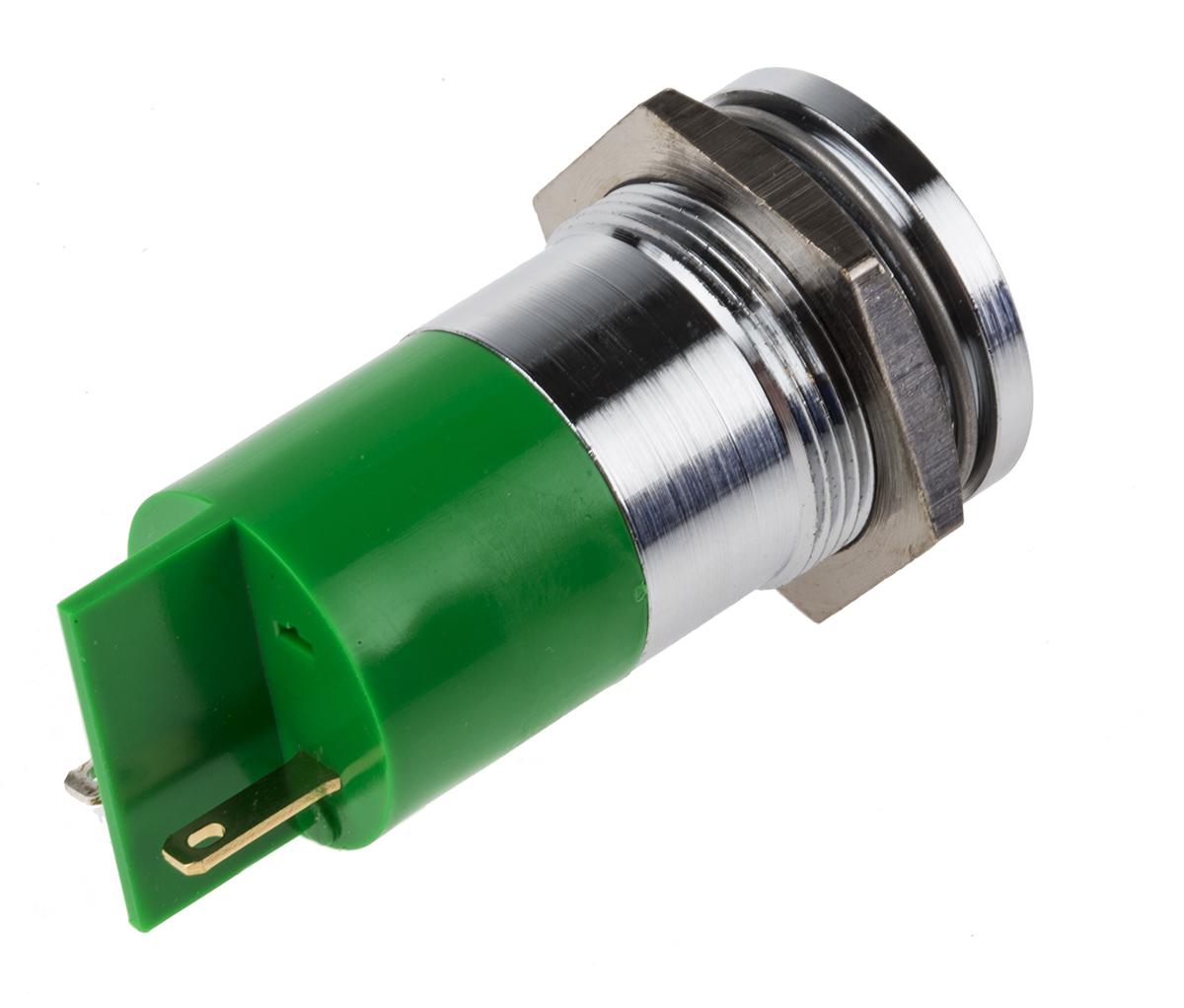 This is Green Indicator 110 V dc 18 mm Lamp Size 22mm Mounting Hole Size IP67 manufactured by RS Pro. The manufacturer part number is 833-2908. Regarding light output colour, it outputs green light colour. The product has a current rating of 5ma. In addition, It features 22mm of mounting hole size. It is IP rated with ip67. Furthermore, the bezel has a classic chrome colour. Moreover, the product has a nominal 110v dc voltage rating. The given intensity of the product is 70mcd. Its accurate length is 39mm. The bezel features a flush style. It is a type of led lamp.