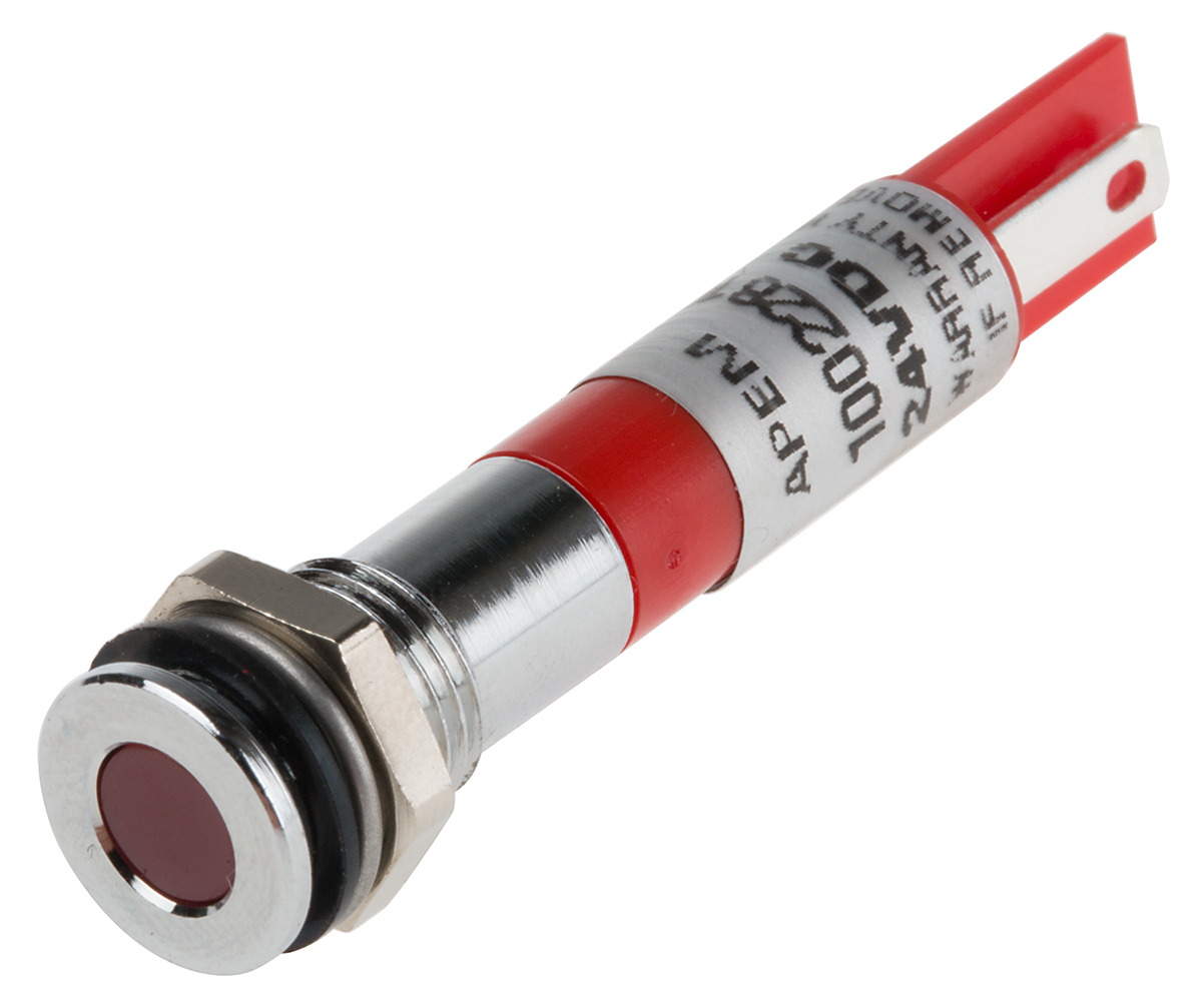 This is Red Indicator 24 V dc 5 mm Lamp Size 8mm Mounting Hole Size IP67 manufactured by RS Pro. The manufacturer part number is 838-5582. Regarding light output colour, it outputs red light colour. The product has a current rating of 20ma. In addition, It features 8mm of mounting hole size. It is IP rated with ip67. Furthermore, the bezel has a classic chrome colour. Moreover, the product has a nominal 24v dc voltage rating. The given intensity of the product is 10mcd. Its accurate length is 28.8mm. The bezel features a flush style. The product is designed with a faston, solder lug termination. It is a type of led lamp.