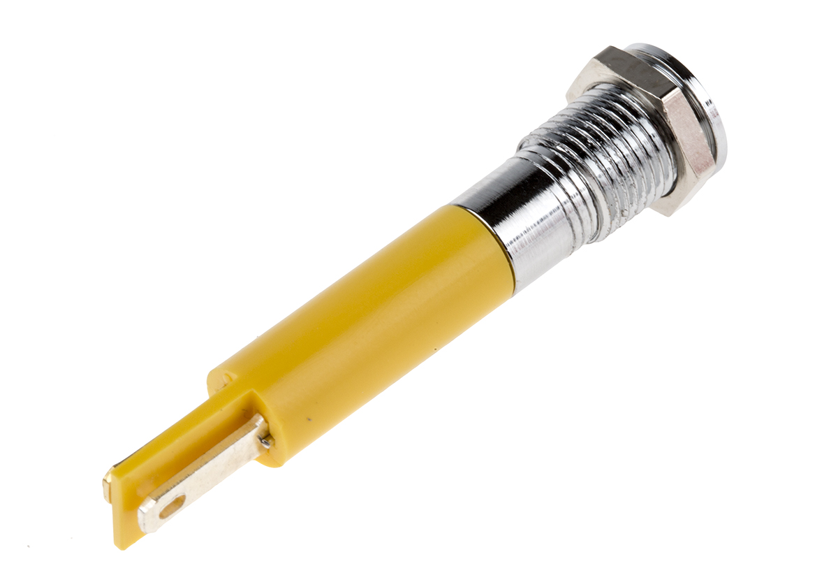 This is Yellow Indicator 24 V dc 5 mm Lamp Size 8mm Mounting Hole Size IP67 manufactured by RS Pro. The manufacturer part number is 838-5595. Regarding light output colour, it outputs yellow light colour. The product has a current rating of 20ma. In addition, It features 8mm of mounting hole size. It is IP rated with ip67. Furthermore, the bezel has a classic chrome colour. Moreover, the product has a nominal 24v dc voltage rating. The given intensity of the product is 6mcd. Its accurate length is 28.8mm. The bezel features a flush style. The product is designed with a faston, solder lug termination. It is a type of led lamp.