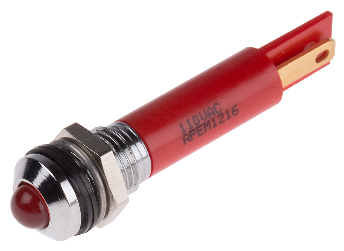 This is Red Indicator 110 V ac 8.5 mm Lamp Size 8mm Mounting Hole Size IP67 manufactured by RS Pro. The manufacturer part number is 846-2709. Regarding light output colour, it outputs red light colour. The product has a current rating of 6ma. In addition, It features 8mm of mounting hole size. It is IP rated with ip67. Furthermore, the bezel has a classic chrome colour. Moreover, the product has a nominal 110v ac voltage rating. The given intensity of the product is 6000mcd. Its accurate length is 28.9mm. The bezel features a prominent style. It is a type of led lamp.