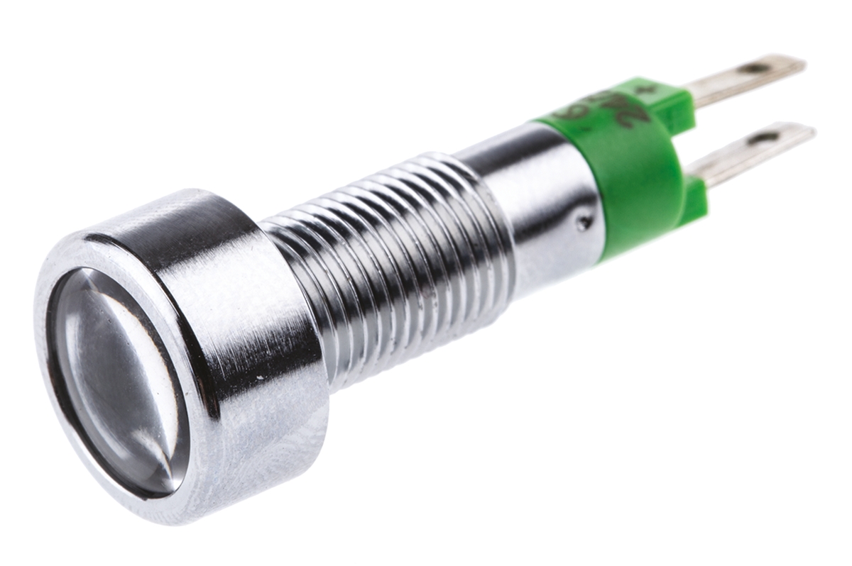 This is Green Indicator 24 → 28 V 10 mm Lamp Size 8mm Mounting Hole Size manufactured by Signal Construct. The manufacturer part number is SMLD08214. Regarding light output colour, it outputs green light colour. The product has a current rating of 10ma. In addition, It features 8mm of mounting hole size. Moreover, the product has a nominal 24 → 28v voltage rating. Furthermore, the bezel has a classic chrome colour. The given intensity of the product is 200mcd. Its accurate length is 37.1mm. The bezel features a flush style. It is a type of led lamp.