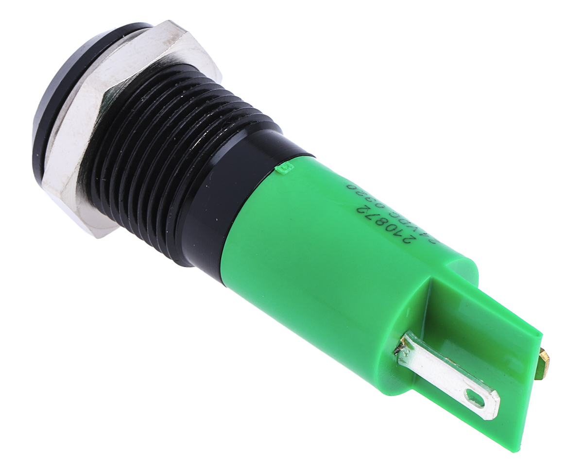 This is Green Indicator 24 V dc 10 mm Lamp Size 14mm Mounting Hole Size manufactured by RS Pro. The manufacturer part number is 210-872. Regarding light output colour, it outputs green light colour. The product has a current rating of 20ma. The product is designed with a solder tab termination. In addition, It features 14mm of mounting hole size. Moreover, the product has a nominal 24v dc voltage rating. Its accurate length is 47mm. The given intensity of the product is 40mcd. The bezel features a prominent style. It is a type of led lamp.