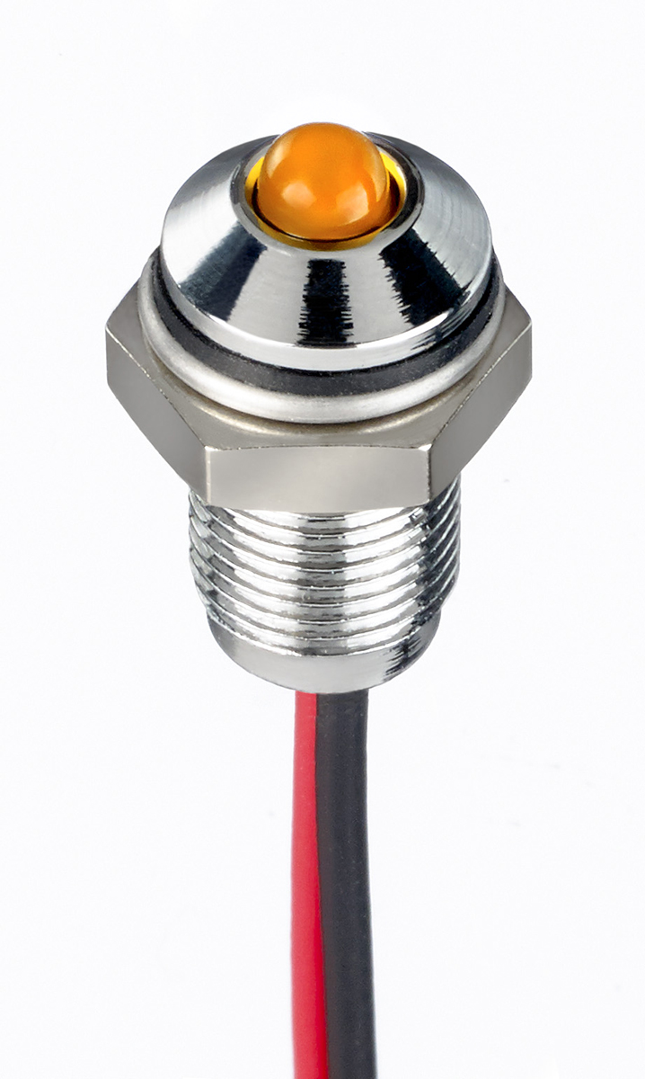 This is Orange Panel LED 21.6 → 26.4 V dc 3 mm Lamp Size 6mm Mounting Hole Size IP67 manufactured by RS Pro. The manufacturer part number is 171-3768. Regarding light output colour, it outputs orange light colour. Its lamp is 3 mm in size . In addition, It features 6mm of mounting hole size. It is IP rated with ip67. Furthermore, the bezel has a classic chrome colour. Moreover, the product has a nominal 21.6 → 26.4v dc voltage rating. The given intensity of the product is 4500mcd. Its accurate length is 13.5mm. The bezel features a prominent style. The product is designed with a lead wires termination. The product has a current rating of 20ma. It is a type of led lamp.