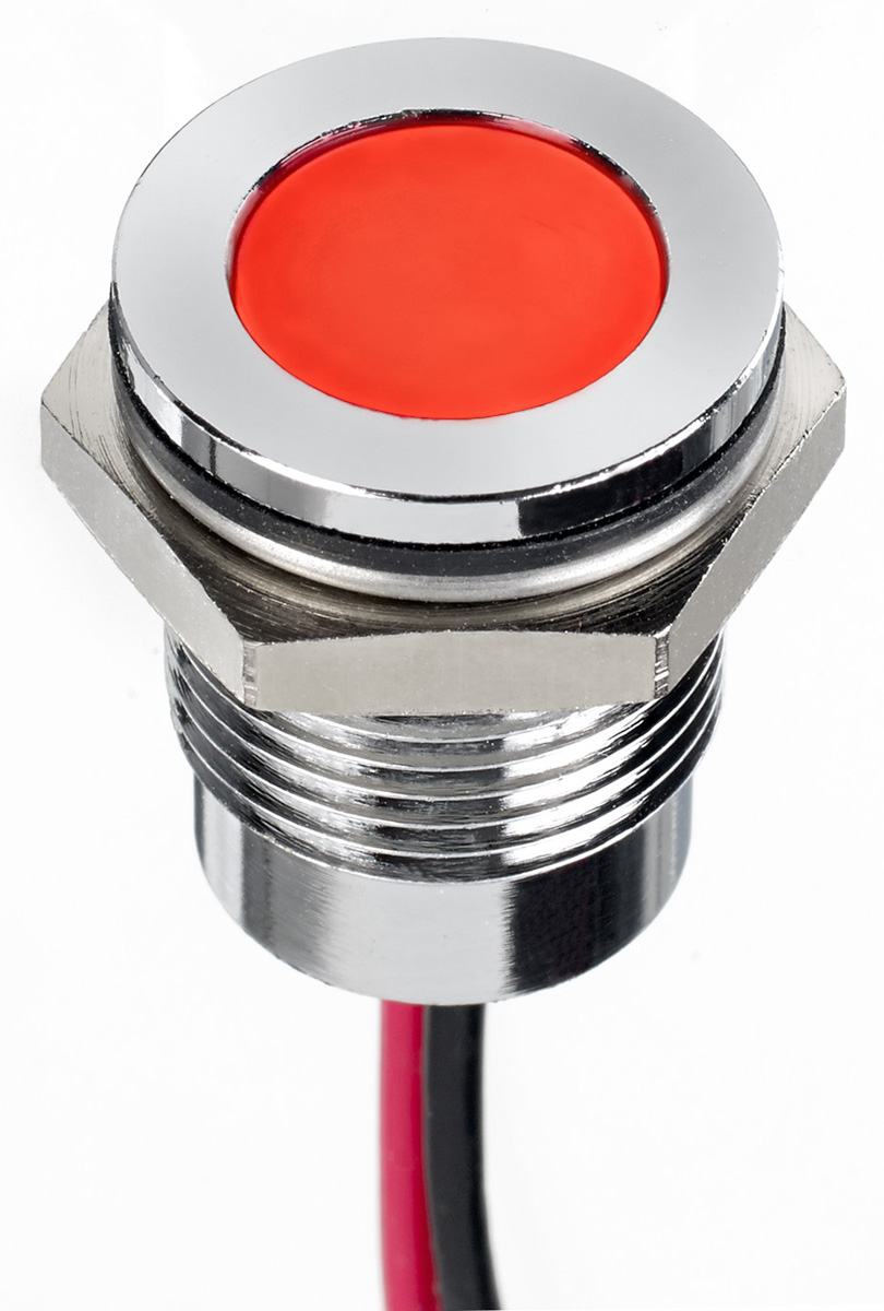 This is Red Indicator 1.8 → 3.3 V dc 10 mm Lamp Size 14mm Mounting Hole Size IP67 manufactured by RS Pro. The manufacturer part number is 130-1094. Regarding light output colour, it outputs red light colour. The product has a current rating of 20ma. In addition, It features 14mm of mounting hole size. It is IP rated with ip67. Furthermore, the bezel has a classic chrome colour. Moreover, the product has a nominal 1.8 → 3.3v dc voltage rating. The given intensity of the product is 800mcd. Its accurate length is 19.4mm. The bezel features a flush style. The product is designed with a lead wires termination. It is a type of led lamp.