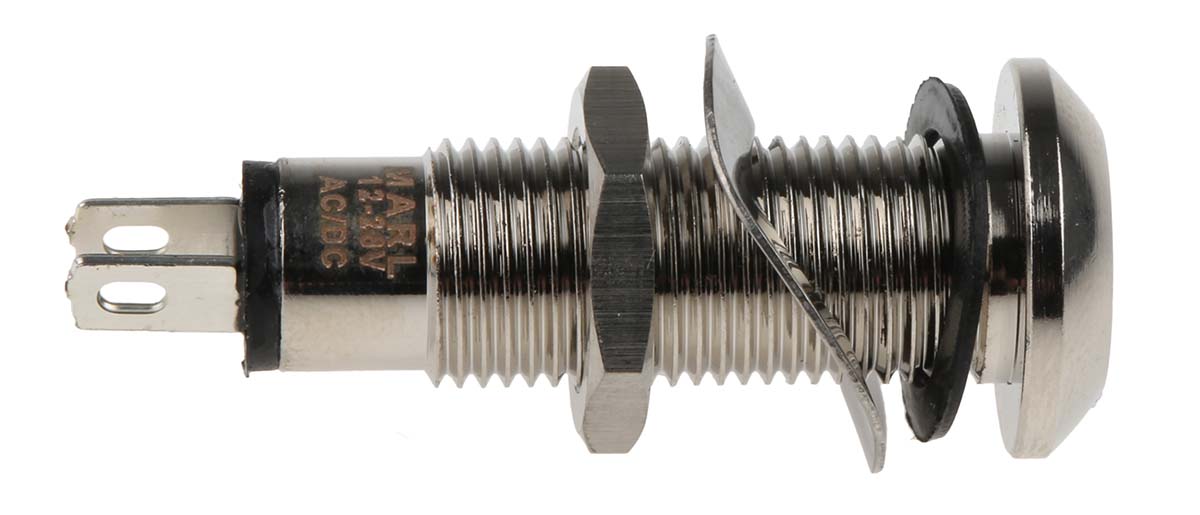 This is Green Indicator 12 → 28 V 7 mm Lamp Size 8.1mm Mounting Hole Size manufactured by Marl. The manufacturer part number is 537-532-63. Regarding light output colour, it outputs green light colour. The product has a current rating of 6 → 16ma. In addition, It features 8.1mm of mounting hole size. It is IP rated with ip67. Furthermore, the bezel has a classic black colour. Moreover, the product has a nominal 12 → 28v voltage rating. Its accurate length is 31.9mm. The bezel features a prominent style. The product is designed with a solder tab termination. It is a type of led lamp.