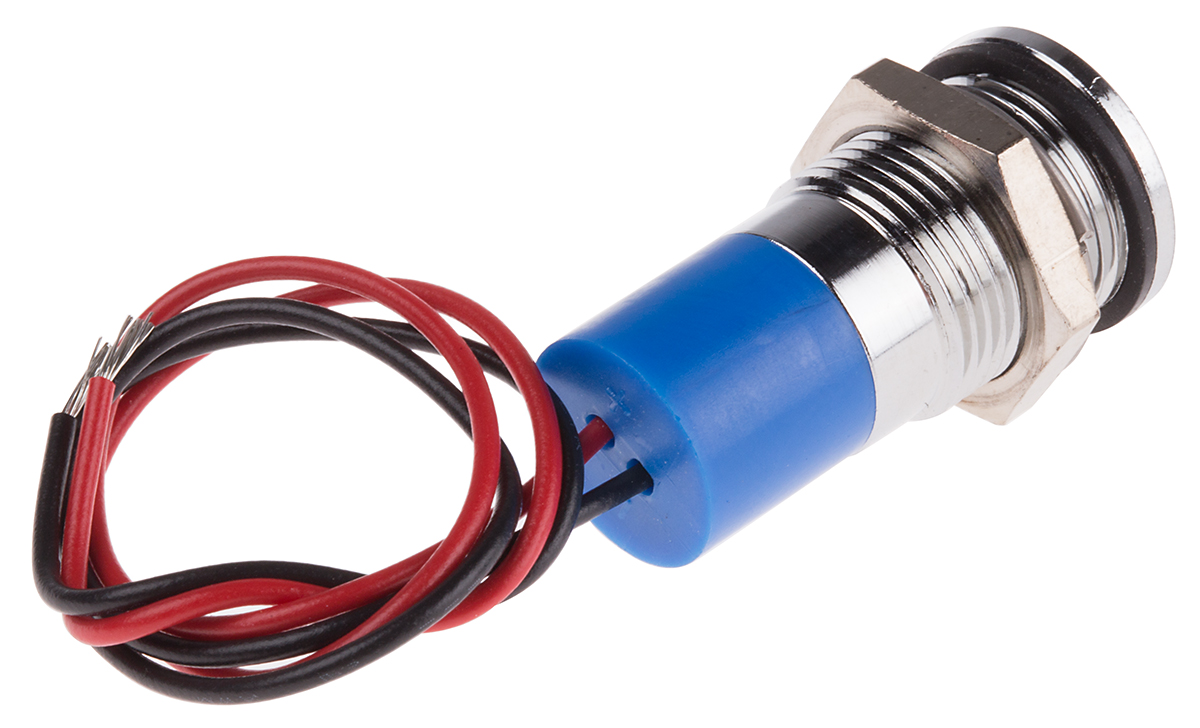 This is Blue Indicator 12 V dc 10 mm Lamp Size 14mm Mounting Hole Size IP67 manufactured by RS Pro. The manufacturer part number is 703-8932. Regarding light output colour, it outputs blue light colour. The product has a current rating of 20ma. In addition, It features 14mm of mounting hole size. It is IP rated with ip67. Furthermore, the bezel has a classic chrome colour. Moreover, the product has a nominal 12v dc voltage rating. The given intensity of the product is 10mcd. Its accurate length is 30.6mm. The bezel features a flush style. The product is designed with a lead wires termination. It is a type of led lamp.