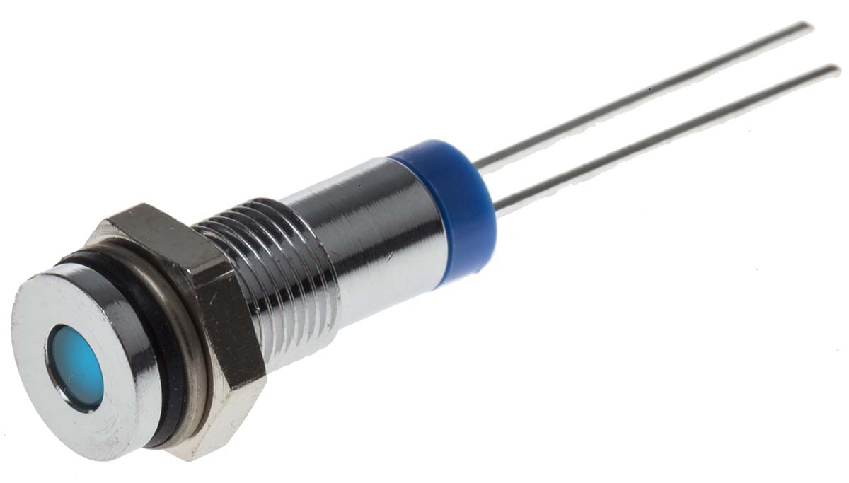 This is Blue Indicator 2 V dc 3 mm Lamp Size 6mm Mounting Hole Size IP67 manufactured by RS Pro. The manufacturer part number is 700-1558. Regarding light output colour, it outputs blue light colour. Its lamp is 3 mm in size . In addition, It features 6mm of mounting hole size. It is IP rated with ip67. Furthermore, the bezel has a classic chrome colour. Moreover, the product has a nominal 2v dc voltage rating. The given intensity of the product is 8mcd. Its accurate length is 15.9mm. The bezel features a flush style. The product has a current rating of 20ma. It is a type of led lamp.