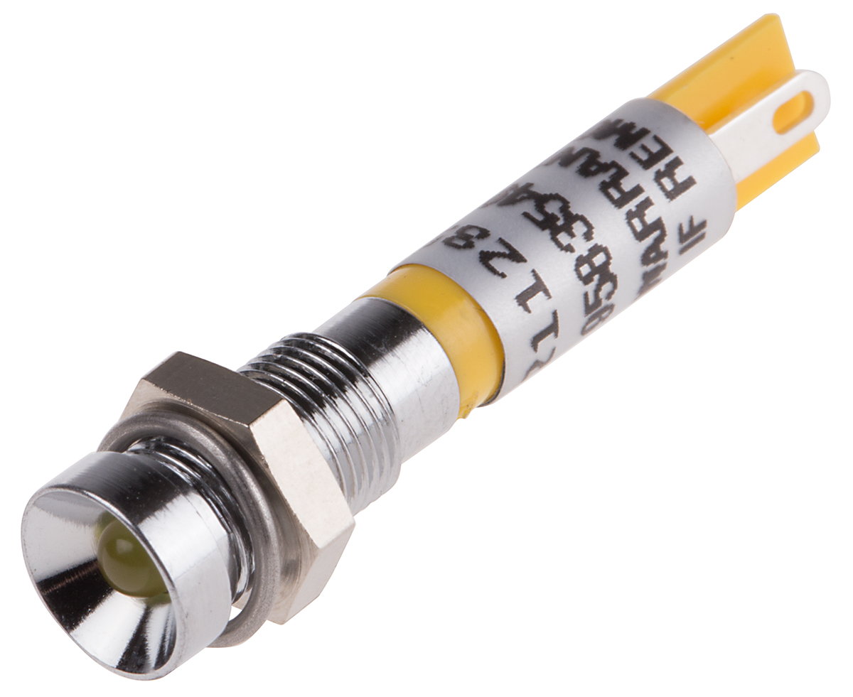 This is Yellow Indicator 12 V dc 3 mm Lamp Size 6mm Mounting Hole Size manufactured by RS Pro. The manufacturer part number is 211-285. Regarding light output colour, it outputs yellow light colour. Its lamp is 3 mm in size . The product is designed with a solder tab termination. The product is available in panel mount configuration. Moreover, the product has a nominal 12v dc voltage rating. Furthermore, the bezel has a classic chrome colour. In addition, It features 6mm of mounting hole size. The given intensity of the product is 30mcd. Its accurate length is 34.4mm. The bezel features a recessed style. The product has a current rating of 20ma. It is a type of led lamp.