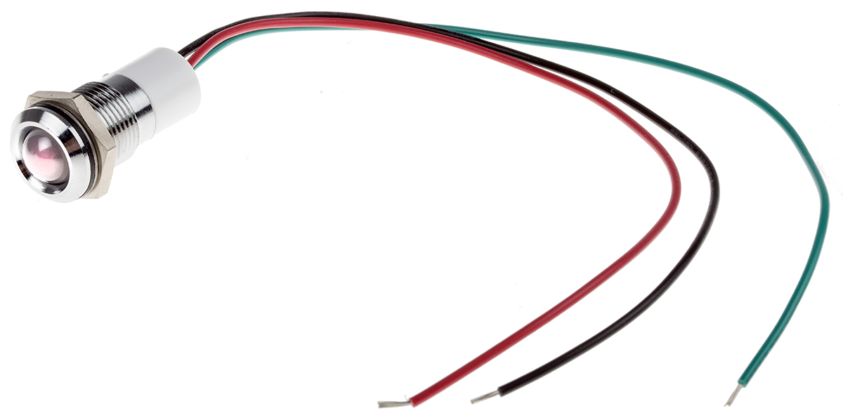 This is Indicator Green Red Yellow IP67 12 V dc 14mm Mounting Hole Size Lead Wires Termination manufactured by RS Pro. The manufacturer part number is 722-7394. The product has a current rating of 20ma. The product is designed with a lead wires termination. In addition, It features 14mm of mounting hole size. It is IP rated with ip67. Furthermore, the bezel has a classic chrome colour. Moreover, the product has a nominal 12v dc voltage rating. Its accurate length is 28.8mm. The bezel features a prominent style. It is a type of led lamp.