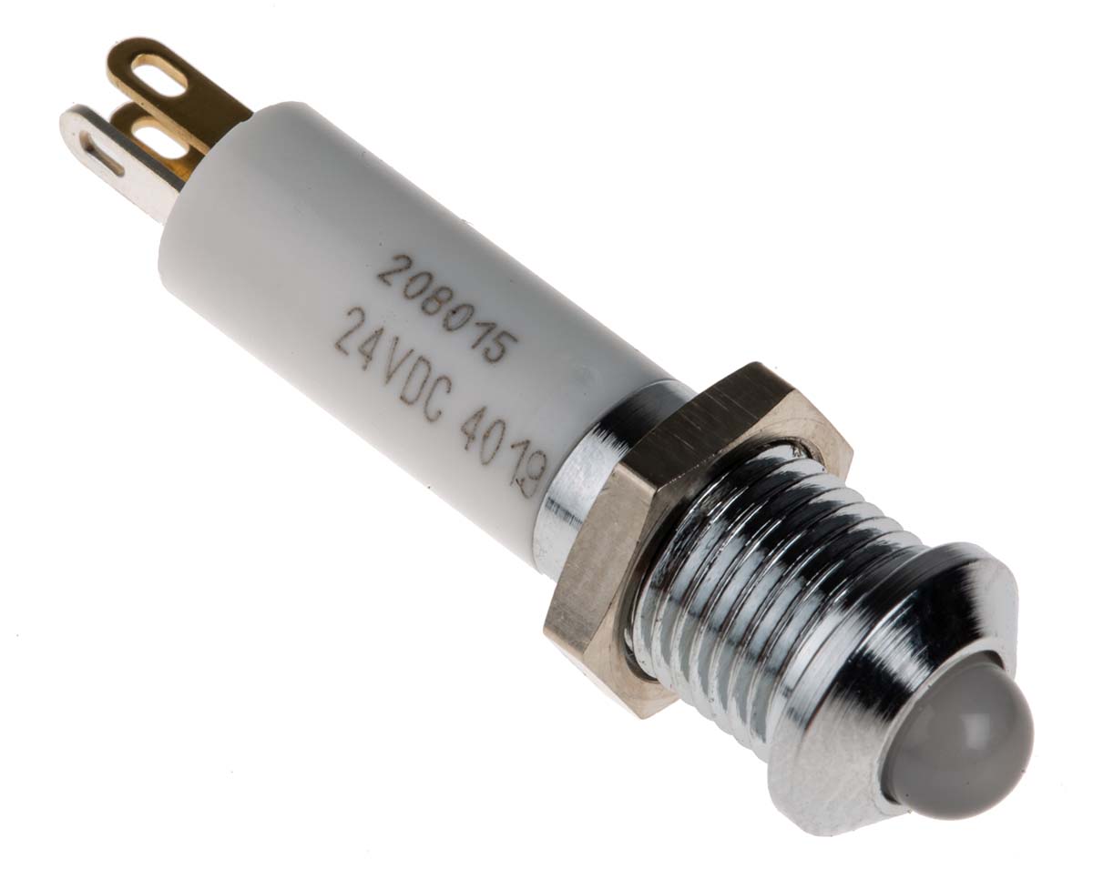 This is Indicator Green Red Yellow 24 V dc 8mm Mounting Hole Size Solder Tab Termination manufactured by RS Pro. The manufacturer part number is 208-015. Regarding light output colour, it outputs green, red, yellow light colour. Its lamp is 5 mm in size . In addition, It features 8mm of mounting hole size. The product is available in panel mount configuration. Moreover, the product has a nominal 24v dc voltage rating. Furthermore, the bezel has a classic chrome colour. The given intensity of the product is 10 mcd, 10 mcd, 20mcd. Its accurate length is 33.9mm. The bezel features a prominent style. The product is designed with a solder tab termination. The product has a current rating of 20ma. It is a type of led lamp.