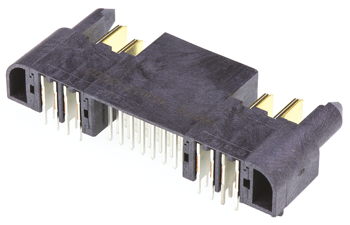 This is EXTREME TEN60POWER Series 46437 Series Number 28 Way 3 Row Right Angle Heavy Duty Power Connector Through Hole manufactured by Molex. The manufacturer part number is 046437-3003. The product contains 28 contacts. The product has a current rating of 2.5 a, 60a. The high-quality gold is used as contact plating material. The product is available in through hole configuration. Moreover, the product has a nominal 250 v, 600 v voltage rating. The product extreme ten60power, is a highly preferred choice for users. It has right angle body orientation. It allows solder termination method. It allows board-to-board connector system. It comes in 3 of rows. Moreover, the product is 5.5mm. The product is made from sturdy copper materials. It comes in connector configuration. It carries [Serial Number] serial number.