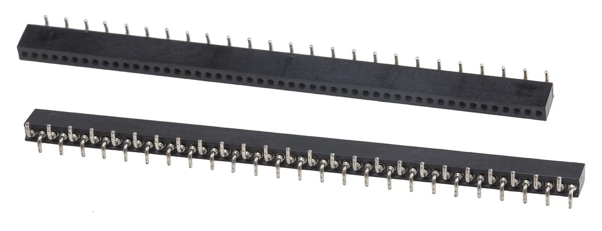 This is 1.27mm Pitch 50 Way 1 Row Right Angle PCB Socket PCB Mount Solder Termination manufactured by RS Pro. The manufacturer part number is 121-6553. The product has a current rating of 12a. The product is available in pcb mount configuration. It has right angle body orientation. It allows solder termination method. It comes in 1 of rows. Moreover, the product is 1.27mm. The product contains 50 contacts. It comes in wire to board configuration. The product is made from sturdy brass materials.