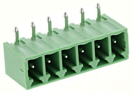 This is 06-381 Series 3.81mm Pitch Right Angle Pluggable Terminal Block Header Through Hole 6 Way manufactured by Amphenol FCI. The manufacturer part number is 20020110-D061A01LF. The product 06-381, is a highly preferred choice for users. The product has a current rating of 8a. The product is available in through hole configuration. Moreover, the product has a nominal 300 v ac voltage rating. In addition, male is the available "Gender" of the product. It has a decent green colour. The product is made from highly stable and reliable nylon. Its accurate length is 23.95mm. It allows solder termination method. Furthermore, the product is 9.2mm wide. The product comes in 7.2mm depth. It comes in 1 of rows. Moreover, the product is 3.81mm. The product contains 6 contacts. It comes in header configuration. It has right angle body orientation.