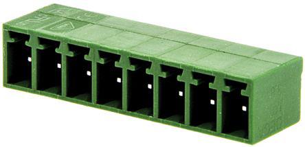 This is 3.81mm Pitch Straight PCB Terminal Strip PCB Header Through Hole 8 Way manufactured by RS Pro. The manufacturer part number is 790-0890. The product has a current rating of 10a. The product is available in through hole configuration. Moreover, the product has a nominal 300 v voltage rating. In addition, male is the available "Gender" of the product. It has a decent green colour. The product is made from highly stable and reliable polyamide. Its accurate length is 30.48mm. It allows push in termination method. Furthermore, the product is 9.2mm wide. The product comes in 6.9mm depth. It comes in 1 of rows. Moreover, the product is 3.81mm. The product contains 8 contacts. It comes in pcb header configuration. It has straight body orientation.
