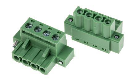 This is 950 Series 5mm Pitch Straight PCB Terminal Block Plug Screw 4 Way manufactured by RS Pro. The manufacturer part number is 874-4767. The product 950, is a highly preferred choice for users. The product has a current rating of 15 (ul) a, 18 (iec) a. The product is available in screw configuration. Moreover, the product has a nominal 600 v voltage rating. In addition, female is the available "Gender" of the product. It has a decent green colour. The product is made from highly stable and reliable polyamide. Its accurate length is 30mm. It allows plug in termination method. Furthermore, the product is 18.1mm wide. The product comes in 15mm depth. It comes in 1 of rows. Moreover, the product is 5mm. The product contains 4 contacts. It comes in plug configuration. It has straight body orientation.