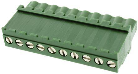 This is 5.08mm Pitch Straight PCB Terminal Strip Plug Cable Mount 10 Way manufactured by RS Pro. The manufacturer part number is 790-0777. The product has a current rating of 16a. The product is available in cable mount configuration. Moreover, the product has a nominal 300 v voltage rating. In addition, female is the available "Gender" of the product. It has a decent green colour. The product is made from highly stable and reliable polyamide. Its accurate length is 50.8mm. It allows screw termination method. Furthermore, the product is 25.8mm wide. The product comes in 12.5mm depth. It comes in 1 of rows. Moreover, the product is 5.08mm. The product contains 10 contacts. It comes in plug configuration. It has straight body orientation.