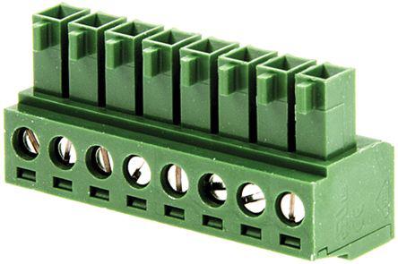 This is 3.81mm Pitch Straight PCB Terminal Strip Plug Cable Mount 8 Way manufactured by RS Pro. The manufacturer part number is 790-0847. The product has a current rating of 10a. The product is available in cable mount configuration. Moreover, the product has a nominal 300 v voltage rating. In addition, female is the available "Gender" of the product. It has a decent green colour. The product is made from highly stable and reliable polyamide. Its accurate length is 31.28mm. It allows screw termination method. Furthermore, the product is 15.6mm wide. The product comes in 11.2mm depth. It comes in 1 of rows. Moreover, the product is 3.81mm. The product contains 8 contacts. It comes in plug configuration. It has straight body orientation.