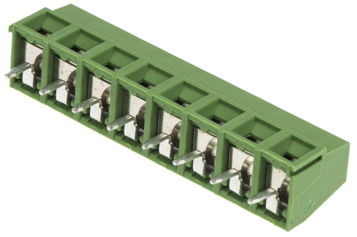 This is Buchanan Series 5mm Pitch Straight PCB Terminal Block Through Hole 8 Way manufactured by TE Connectivity. The manufacturer part number is 282836-8. The product has a current rating of 13.5a. The product is available in through hole configuration. Moreover, the product has a nominal 300 v ac voltage rating. The product buchanan, is a highly preferred choice for users. It has a decent green colour. It allows screw termination method. Its accurate length is 40mm. Furthermore, the product is 10mm wide. The product comes in 8.2mm depth. It comes in 1 of rows. Moreover, the product is 5mm. The product contains 8 contacts. It comes in pcb terminal block configuration. It has straight body orientation.