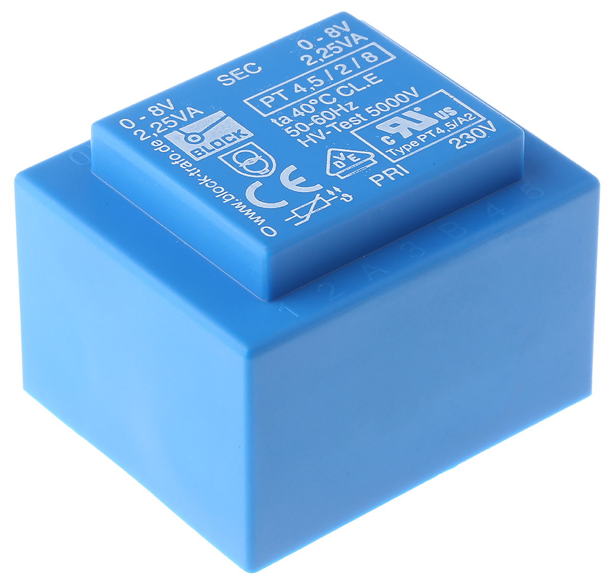 This is 8V ac 2 Output Through Hole PCB Transformer 4.5VA manufactured by Block. The manufacturer part number is PT 4.5/2/8. Additionally, the product is supplied with 2 outputs. The product has +40°c maximum temperature. The given dimensions of the product include 44 x 33 x 37mm. The typical product's weight is 190g. It has about 230v ac primary voltage rating . Its accurate length is 44mm. Furthermore, the product is 33mm wide. The product comes in 37mm depth. In addition, it has a secondary 8v ac voltage rating . The product is available in through hole configuration. Feature 4.5va of power rating.