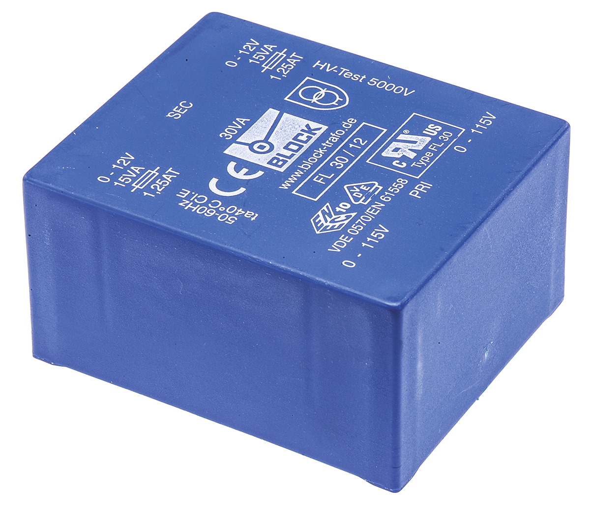 This is 12V ac 2 Output Through Hole PCB Transformer 30VA manufactured by Block. The manufacturer part number is FL30/12. Additionally, the product is supplied with 2 outputs. The product has +40°c maximum temperature. The given dimensions of the product include 68 x 35.8 x 57mm. The typical product's weight is 530g. It has about 115v ac, 230v ac primary voltage rating . Its accurate length is 68mm. It carries 60hz of maximum operating frequency. Furthermore, the product is 35.8mm wide. The product comes in 57mm depth. In addition, it has a secondary 12v ac voltage rating . It has a minimum 50hz operating frequency . The product is available in through hole configuration. Feature 30va of power rating.