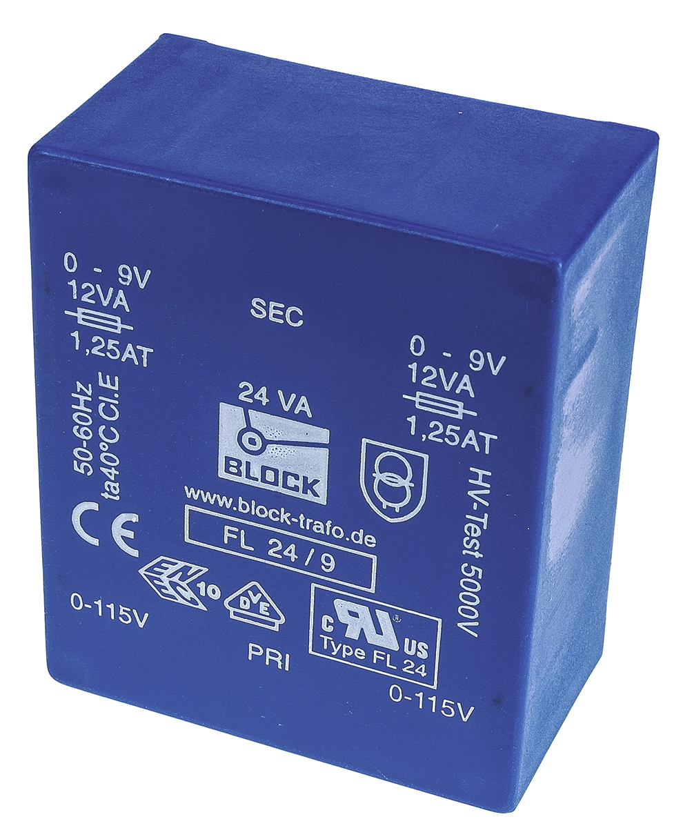 This is 9V ac 2 Output Through Hole PCB Transformer 24VA manufactured by Block. The manufacturer part number is FL 24/9. Additionally, the product is supplied with 2 outputs. The product has +40°c maximum temperature. The given dimensions of the product include 68 x 31.4 x 57mm. The typical product's weight is 445g. It has about 115v ac, 230v ac primary voltage rating . Its accurate length is 68mm. It carries 60hz of maximum operating frequency. Furthermore, the product is 31.4mm wide. The product comes in 57mm depth. In addition, it has a secondary 9v ac voltage rating . It has a minimum 50hz operating frequency . The product is available in through hole configuration. Feature 24va of power rating.