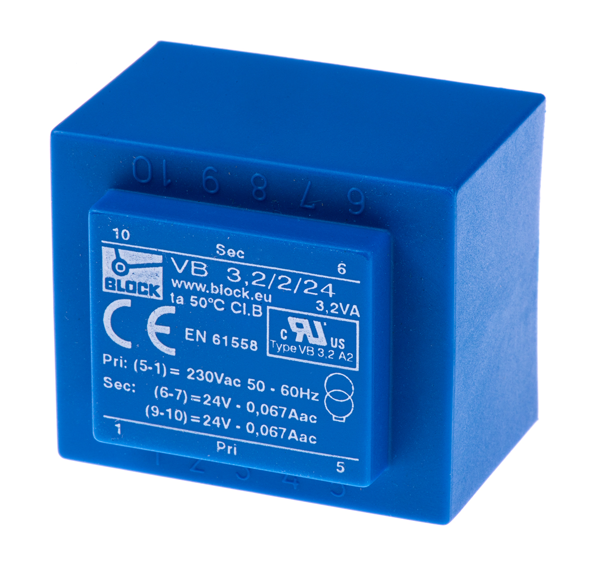 This is 24V ac 2 Output Through Hole PCB Transformer 3.2VA manufactured by Block. The manufacturer part number is VB 3.2/2/24. Additionally, the product is supplied with 2 outputs. The product has +70°c maximum temperature. The given dimensions of the product include 41 x 30.8 x 35mm. The typical product's weight is 173g. It has about 230v ac primary voltage rating . Its accurate length is 41mm. Furthermore, the product is 30.8mm wide. The product comes in 35mm depth. In addition, it has a secondary 24v ac voltage rating . The product is available in through hole configuration. Feature 3.2va of power rating.