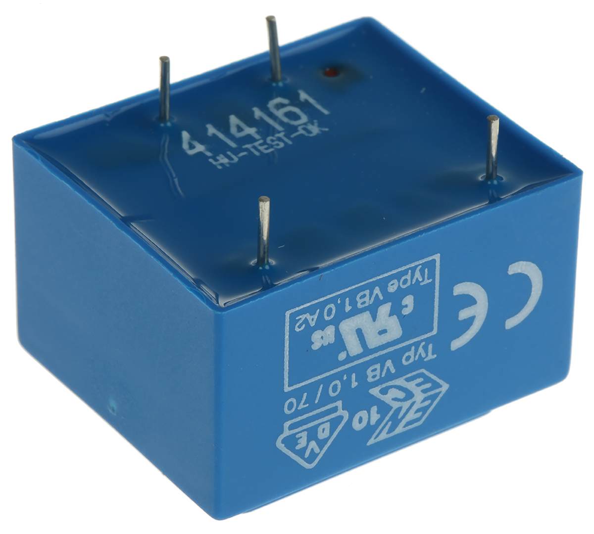 This is 6V ac 1 Output Through Hole PCB Transformer 1VA manufactured by Block. The manufacturer part number is VB 1,0/1/6. Additionally, the product is supplied with 1 outputs. The product has +70°c maximum temperature. The given dimensions of the product include 32.3 x 27.3 x 21.8mm. The typical product's weight is 70g. It has about 230v ac primary voltage rating . Its accurate length is 32.3mm. It carries 60hz of maximum operating frequency. Furthermore, the product is 27.3mm wide. The product comes in 21.8mm depth. In addition, it has a secondary 6v ac voltage rating . It has a minimum 50hz operating frequency . The product is available in through hole configuration. Feature 1va of power rating.