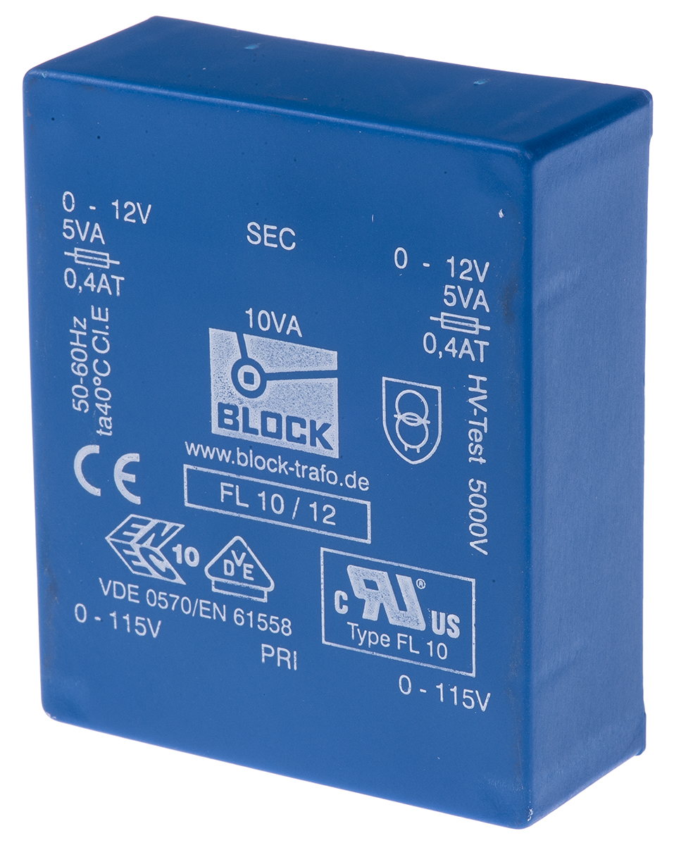 This is 12V ac 2 Output Through Hole PCB Transformer 10VA manufactured by Block. The manufacturer part number is FL 10/12. Additionally, the product is supplied with 2 outputs. The product has +40°c maximum temperature. The given dimensions of the product include 68 x 22.8 x 57mm. The typical product's weight is 280g. It has about 115v ac, 230v ac primary voltage rating . Its accurate length is 68mm. It carries 60hz of maximum operating frequency. Furthermore, the product is 22.8mm wide. The product comes in 57mm depth. In addition, it has a secondary 12v ac voltage rating . It has a minimum 50hz operating frequency . The product is available in through hole configuration. Feature 10va of power rating.