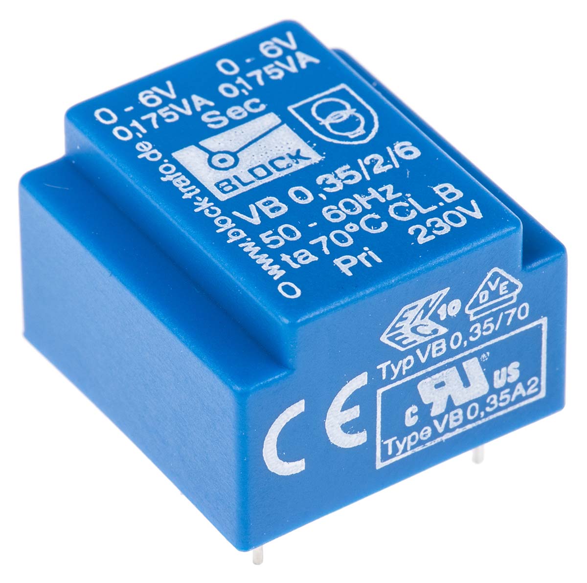 This is 6V ac 2 Output Through Hole PCB Transformer 0.35VA manufactured by Block. The manufacturer part number is VB 0.35/2/6. Additionally, the product is supplied with 2 outputs. The product has +70°c maximum temperature. The given dimensions of the product include 22 x 15 x 22.7mm. The typical product's weight is 24g. It has about 230v ac primary voltage rating . Its accurate length is 22mm. Furthermore, the product is 15mm wide. The product comes in 22.7mm depth. In addition, it has a secondary 6v ac voltage rating . The product is available in through hole configuration. Feature 0.35va of power rating.
