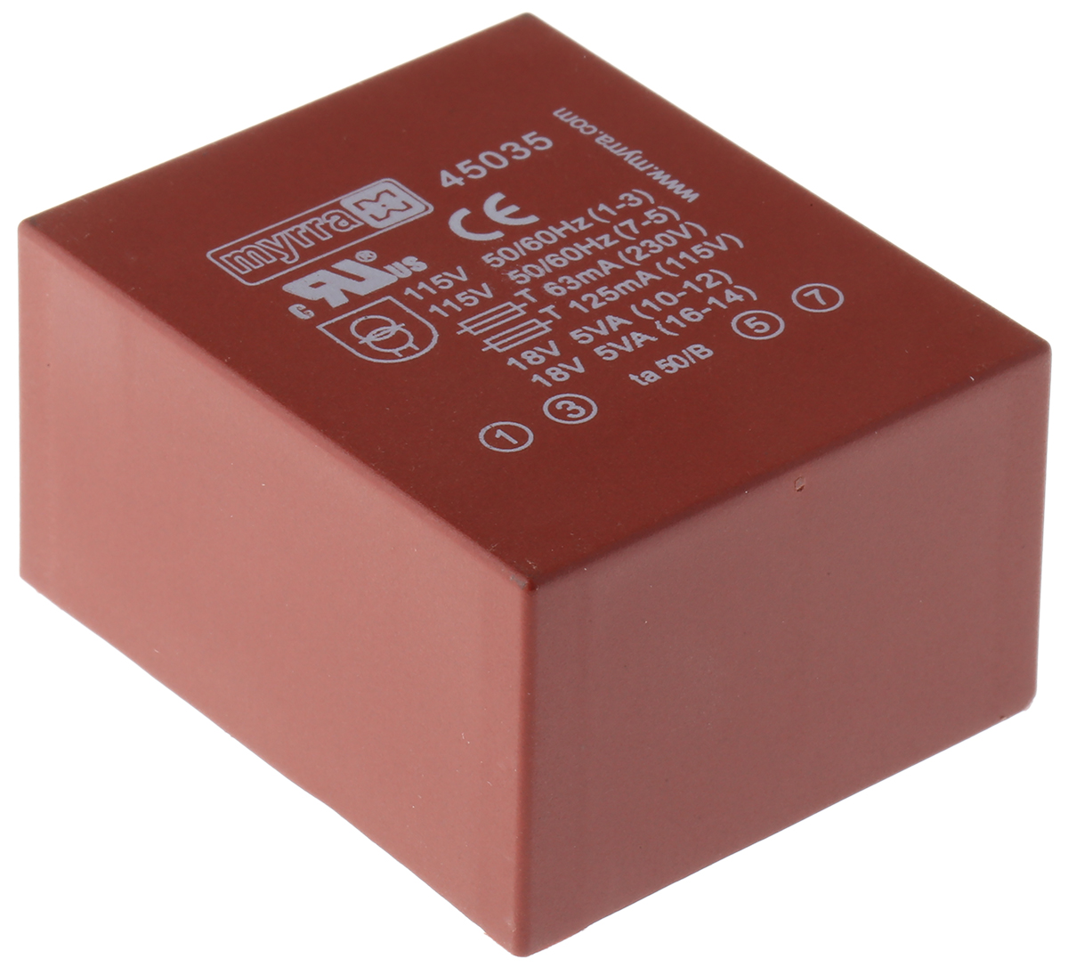 This is 18V ac 2 Output Through Hole PCB Transformer 10VA manufactured by Myrra. The manufacturer part number is 45035. Additionally, the product is supplied with 2 outputs. The product has +70°c maximum temperature. The given dimensions of the product include 53 x 44 x 24mm. The typical product's weight is 260g. It has about 230v ac primary voltage rating . Its accurate length is 53mm. It carries 60hz of maximum operating frequency. Furthermore, the product is 44mm wide. The product comes in 24mm depth. In addition, it has a secondary 18v ac voltage rating . It has a minimum 50hz operating frequency . The product is available in through hole configuration. Feature 10va of power rating.