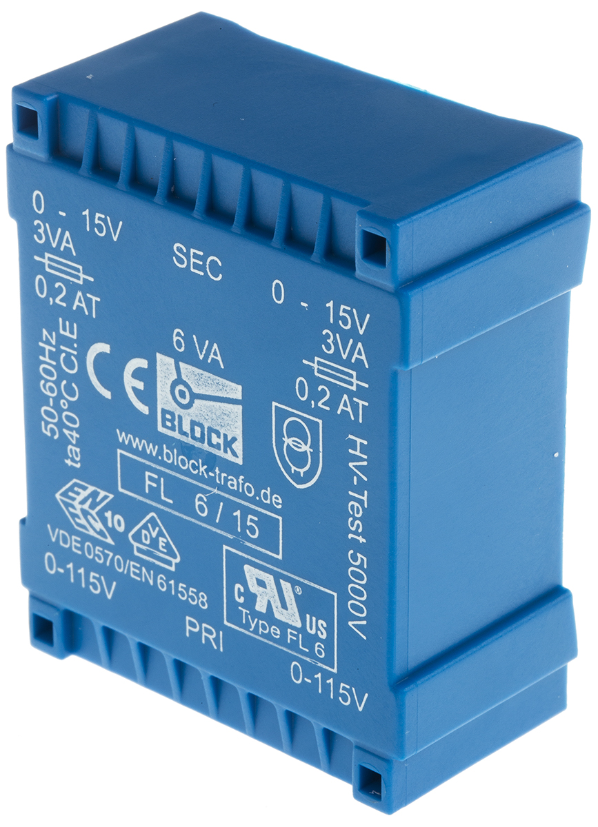 This is 15V ac 2 Output Through Hole PCB Transformer 6VA manufactured by Block. The manufacturer part number is FL 6/15. Additionally, the product is supplied with 2 outputs. The product has +40°c maximum temperature. The given dimensions of the product include 53 x 22.6 x 44mm. The typical product's weight is 175g. It has about 115v ac, 230v ac primary voltage rating . Its accurate length is 53mm. It carries 60hz of maximum operating frequency. Furthermore, the product is 22.6mm wide. The product comes in 44mm depth. In addition, it has a secondary 15v ac voltage rating . It has a minimum 50hz operating frequency . The product is available in through hole configuration. Feature 6va of power rating.
