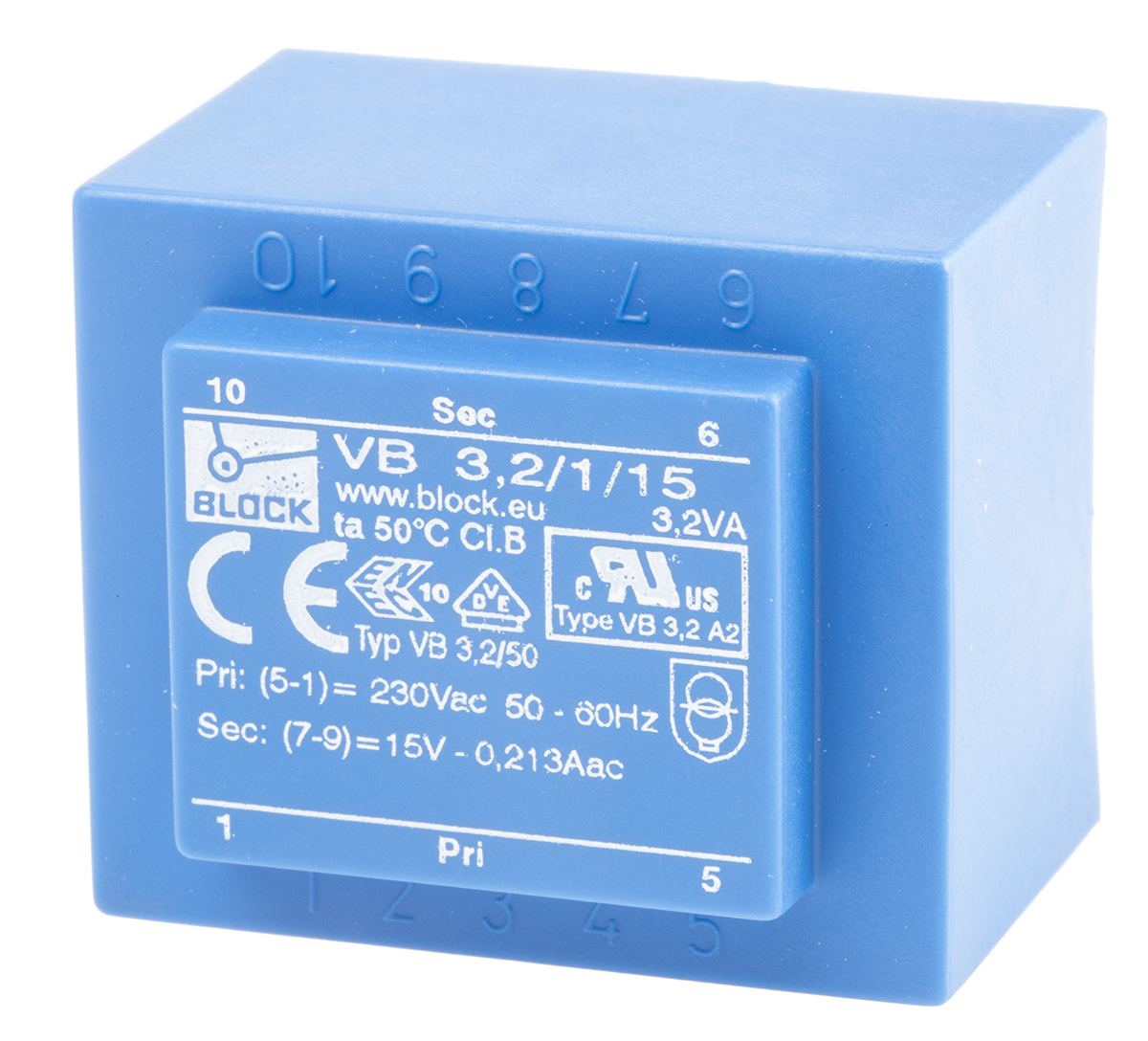 This is 15V ac 1 Output Through Hole PCB Transformer 3.2VA manufactured by Block. The manufacturer part number is VB 3,2/1/15. Additionally, the product is supplied with 1 outputs. The product has +70°c maximum temperature. The given dimensions of the product include 41 x 35 x 30.8mm. The typical product's weight is 170g. It has about 230v ac primary voltage rating . Its accurate length is 41mm. It carries 60hz of maximum operating frequency. Furthermore, the product is 35mm wide. The product comes in 30.8mm depth. In addition, it has a secondary 15v ac voltage rating . It has a minimum 50hz operating frequency . The product is available in through hole configuration. Feature 3.2va of power rating.
