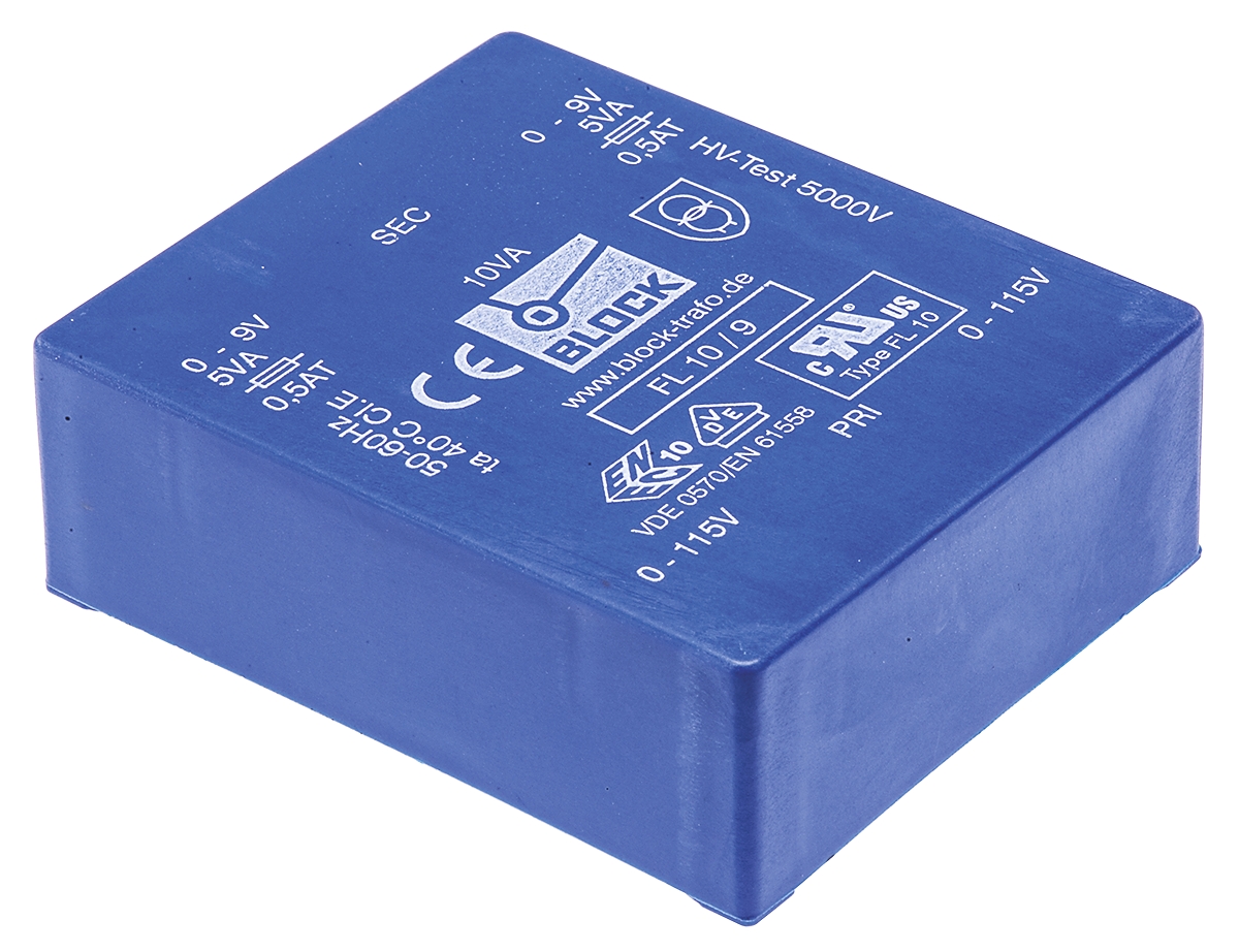 This is 9V ac 2 Output Through Hole PCB Transformer 10VA manufactured by Block. The manufacturer part number is FL 10/9. Additionally, the product is supplied with 2 outputs. The product has +40°c maximum temperature. The given dimensions of the product include 68 x 22.8 x 57mm. The typical product's weight is 280g. It has about 115v ac, 230v ac primary voltage rating . Its accurate length is 68mm. It carries 60hz of maximum operating frequency. Furthermore, the product is 22.8mm wide. The product comes in 57mm depth. In addition, it has a secondary 9v ac voltage rating . It has a minimum 50hz operating frequency . The product is available in through hole configuration. Feature 10va of power rating.