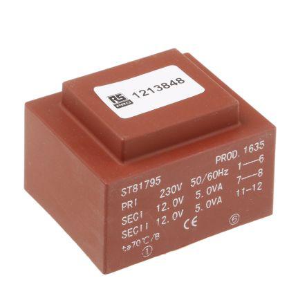 This is 2 x 12V ac 2 Output PCB Mount PCB Transformer 10VA manufactured by RS Pro. The manufacturer part number is 121-3848. Additionally, the product is supplied with 2 outputs. The product has +130°c maximum temperature. The given dimensions of the product include 51 x 43 x 35mm. The typical product's weight is 300g. It has about 230v ac primary voltage rating . Its accurate length is 51mm. It carries 60hz of maximum operating frequency. Furthermore, the product is 43mm wide. The product comes in 35mm depth. In addition, it has a secondary 2 x 12v ac voltage rating . It has a minimum 50hz operating frequency . The product is available in pcb mount configuration. Feature 10va of power rating.