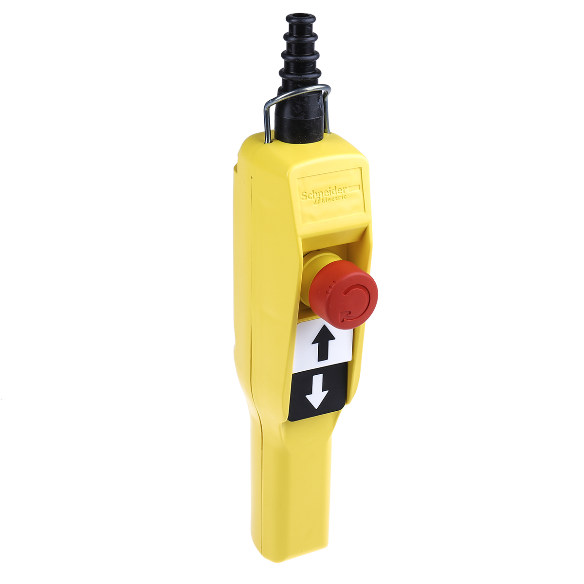 This is NC Emergency Stop Push Button NO/NC First & Second Push Button 3 Push Button Pendant Station manufactured by Schneider Electric. The manufacturer part number is XACA2053. Better World Verification Options - green premium. Is it a better world product? yes. While it has an adorable black, red, white colour. Moreover, the product has a nominal 600v voltage rating. It is IP rated with ip65. It has down arrow, e-stop, up arrow marking on push button . The contact is equipped with nc emergency stop push button, no/nc first & second push button configuration. It has 3 push buttons included . Its is offered with yellow colour enclosure . The terminal is a screw type.