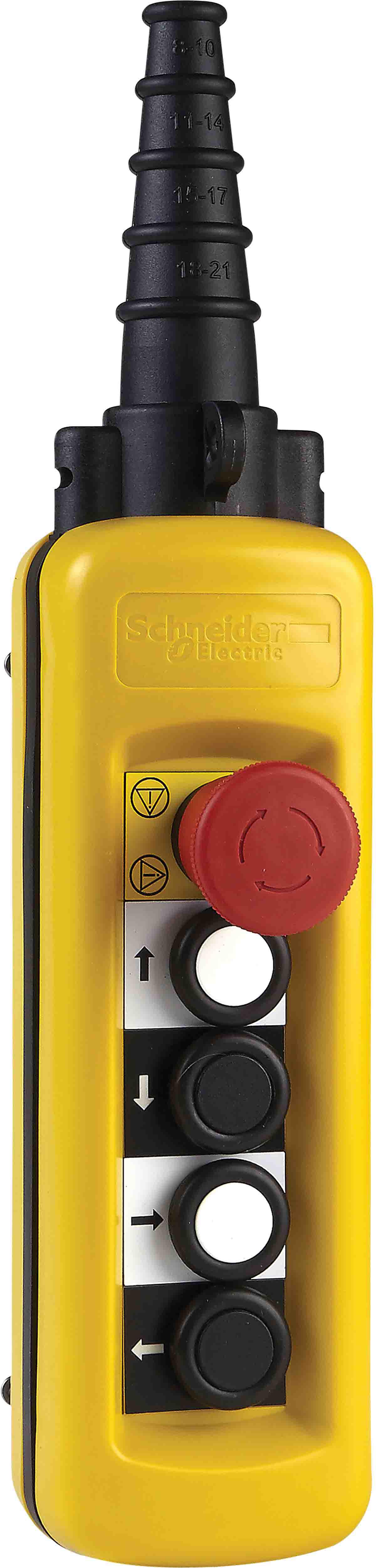 This is PENDANT CONTROL STATION manufactured by Schneider Electric. The manufacturer part number is XACA4714. The contact is equipped with 1 nc+4no configuration. It is IP rated with ip65.