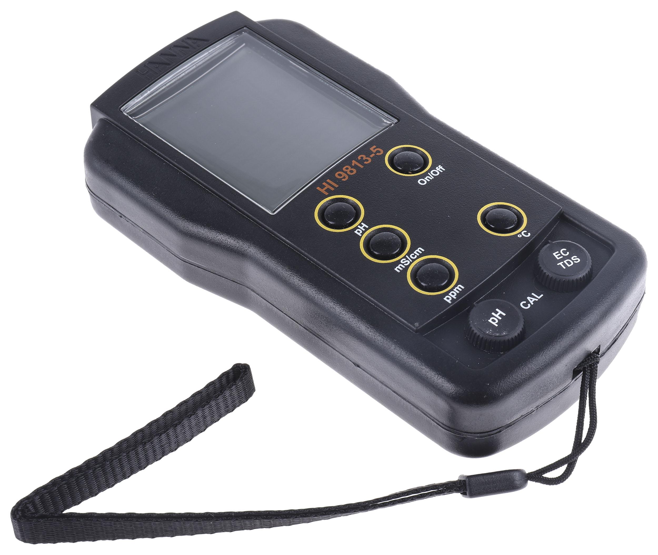 This is pH & Water Analysis Meter 0 → 4 mS/cm 0 → +14 pH manufactured by Hanna Instruments. The manufacturer part number is HI 9813-5N. The given dimensions of the product include 165 x 75 x 45mm. Moreover, the product gets power from battery. 0ppm is the minimum total dissolved solids . It has a 0.1°c temperature measurement resolution . Furthermore, the product is 75mm wide. Its battery life is about 150 h . With 0.1ph pH resolution . 1999ppm is the amount of maximum total dissolved solids . While it has hi 9813-5n of model number. Additionally, it has a maximum +60 °c temperature measurement . This 9v battery is comparatively much efficient than common batteries. 1ppm is the total dissolved solids resolution of the product . 0.01ms/cm is the conductivity resolution of the product . It has the best pH accuracy of ±0.1ph . Additionally, it has the best total dissolved solids accuracy of ±2% . It has a standard 0ph minimum pH . With 4ms/cm maximum conductivity . Its accurate length is 165mm. It has about +14ph maximum pH . It has about ±0.5 °c best temperature measurement accuracy . The typical product's weight is 180g. It has a maximum operating temperature of +50°c. It has 0°c of minimum temperature measurement . In addition, the height is 45mm. It has a 0ms/cm minimum conductivity . Whereas, the minimum operating temperature of the product is 0°c. ±2% is the best conductivity accuracy of the product .
