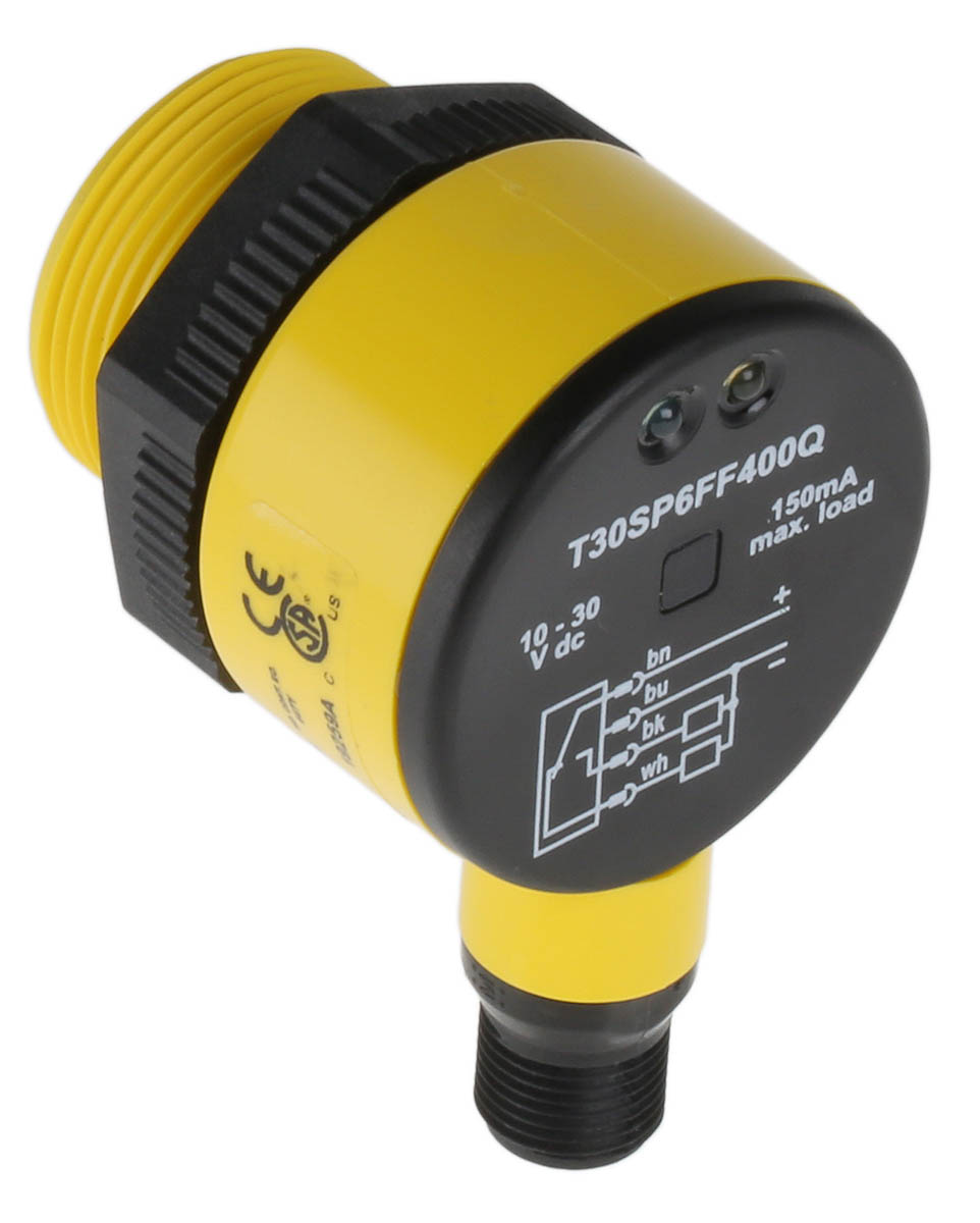 This is Diffuse Photoelectric Sensor 400 mm Detection Range PNP IP69K Barrel Style manufactured by Banner. The manufacturer part number is T30SP6FF400Q. The product also features robust pbt, plastic housing material. The product complies with all safety standards, such as ce. It also carries 150 ma maximum current. It is IP rated with ip69k. The product t30, is a highly preferred choice for users. It has provided with m12 connector electrical connection. The device is designed to detect diffuse. Furthermore, it has apnp output. It has a typical thread size of m12. Its switching mode is light / dark switching . The product has 400 mm of detection range. The sensor has a barrel design. It responds within 3 ms. It has 30v maximum DC voltage. It has a maximum operating temperature of +70°c. Whereas, the minimum operating temperature of the product is -40°c. Uses infrared led as a light source.