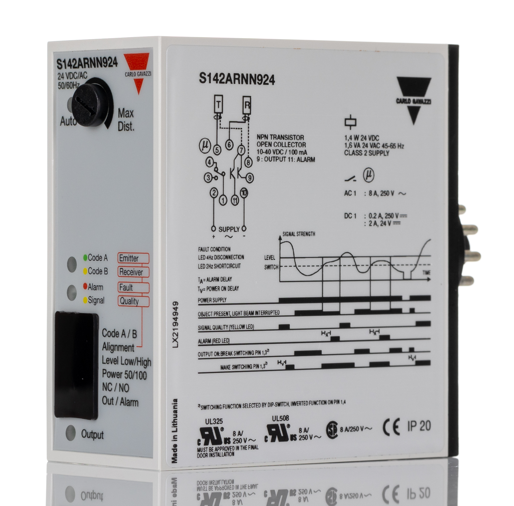 This is Photoelectric Sensor Amplifier NPN NO/NC IP20 Block Style manufactured by Carlo Gavazzi. The manufacturer part number is S142ARNN924. It has 24v maximum DC voltage. A bespoke product carries 24v of maximum AC voltage. Whereas, the minimum operating temperature of the product is -20°c. It is IP rated with ip20. The sensor has a block design. Furthermore, it has a2 npn, relay output. The product also features robust noryl se1 housing material. It responds within 20 ms, 30 ms. It has a maximum operating temperature of +50°c. Uses led as a light source.