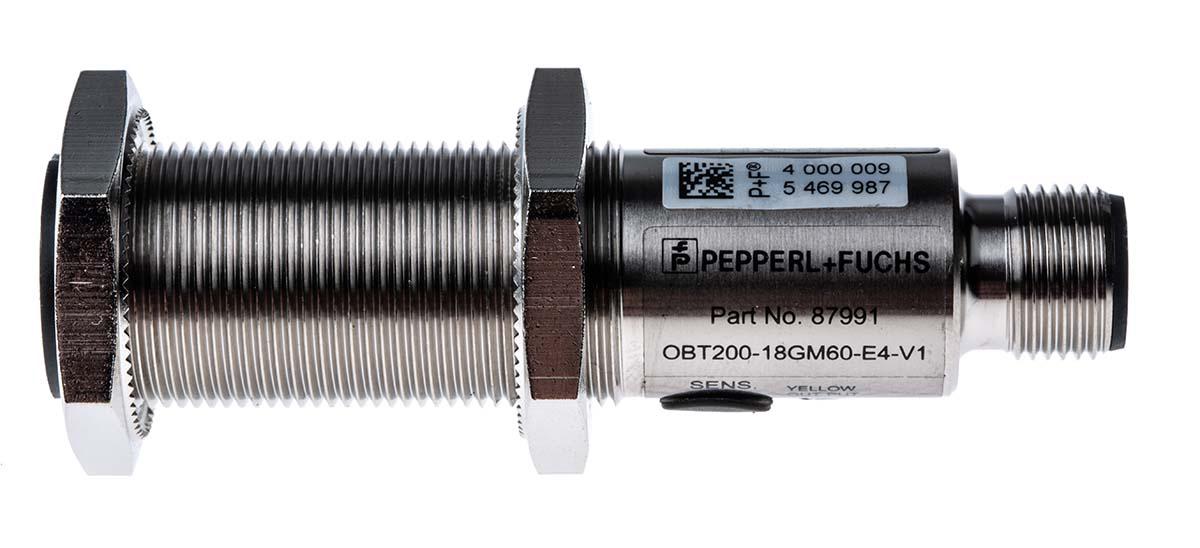 This is Diffuse Photoelectric Sensor 200 mm Detection Range NPN IP67 Barrel Style manufactured by Pepperl + Fuchs. The manufacturer part number is OBT200-18GM60-E4-V1. It has 30v maximum DC voltage. It also carries 100 ma maximum current. It is IP rated with ip67. The sensor has a barrel design. It has provided with m12 4 pin connector electrical connection. The device is designed to detect diffuse. Furthermore, it has anpn output. The product also features robust nickel plated brass housing material. The product has 200 mm of detection range. Whereas, the minimum operating temperature of the product is -25°c. It responds within <=1 ms. It has a maximum operating temperature of +55°c. Uses infrared as a light source.
